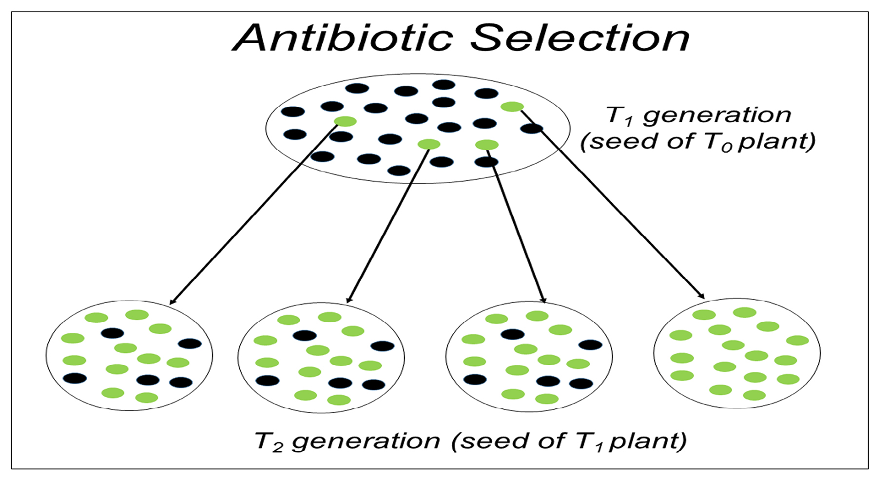 (a) Antibiotic selection: The basis of antibiotic selection depends upon two conditions, one the transgene should behave as dominant trait and second it should follow the Mendel first law of segregation. The seeds of T0 transgenic plants are selected on the plate of particular antibiotic marker (e.g., hygromycin or kanamycin) present in vector used for transformation. The seeds collected from individual plants and plate few seeds of each plant on selection media (Murashige and Skoog Medium with antibiotic) (Fig. 2). Count the number of germinating seedlings in T1 population of each plant. As stated earlier antibiotic marker is dominant, it gives 75% of the progeny resistant for a single insertion. Anything above 0.75 will be considered as multiple insertion and rejected. The plate showing 100% germination indicates that resistant gene (transgene) is present in all the seed, implying that its parents must have a homozygous condition.