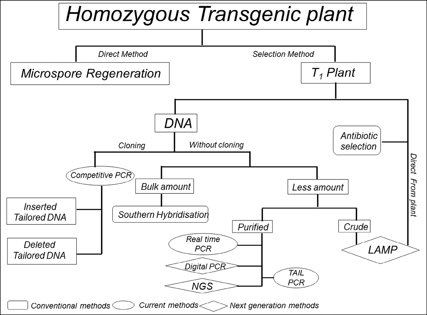 Knowledge of zygosity status for a transgene locus is highly essential in plants, especially for those which have longer reproductive cycles. Identification of stable transformants and homozygous lines in initial generations itself is of great importance. Presently, many efficient, iterative and high throughput techniques are available but still most of the laboratories rely on Southern hybridization because it is still the most robust, unambiguous and extensively used method for zygosity testing in plants. However, it is labor intensive and time consuming and therefore, this is the right time to shift our gears to the modern next generation techniques like NGS and dPCR for high-throughput selection of transgenic plants. dPCR is emerging as the most appropriate method for zygosity testing due to the reliable and highly consistent results, similar to Southern hybridization, but with advantages such as high speed which puts it ahead of all other available techniques. Thus, based on the review of all the available methods (Table 1), we conclude that, dPCR is the most accurate, reliable, precise and fast method in the determination of transgene zygosity. There is a need for acceptance of these techniques which could speed up the screening and characterization of transgenic events. These next generation techniques could be proven to be useful tool to test the hypotheses put forward by basic researchers, and as a valuable tool for applied transgenic research to address the key issues of food security and global environmental changes.
