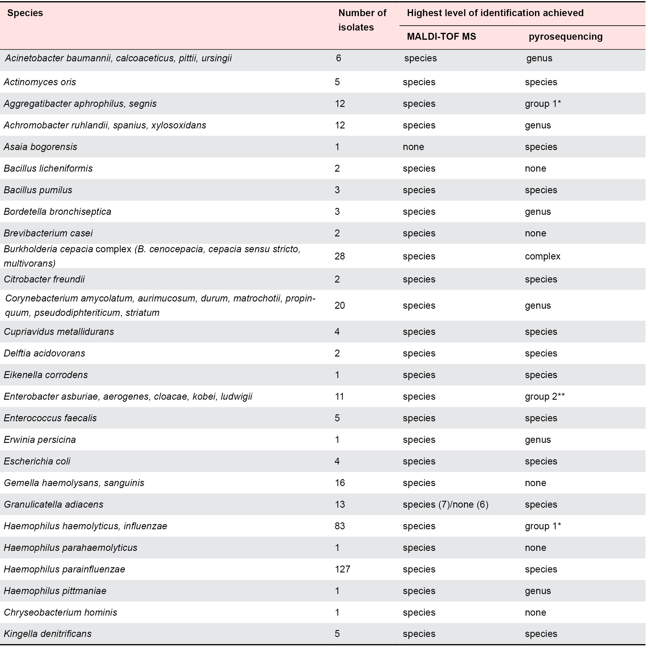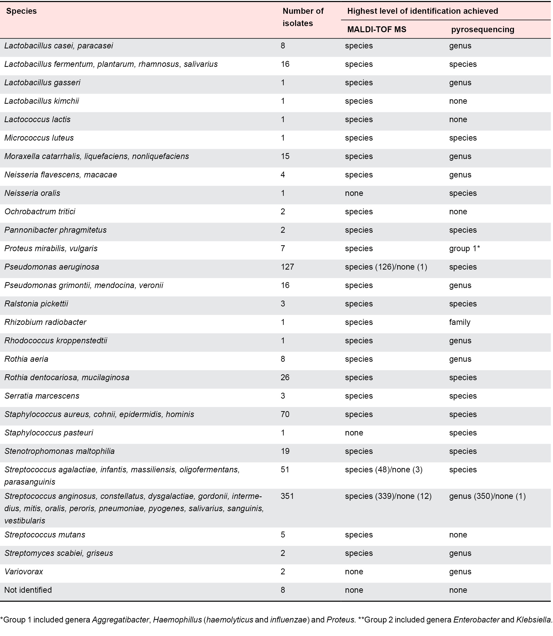 Table 1. List of species and results of identification by MALDI-TOF MS and pyrosequencing.