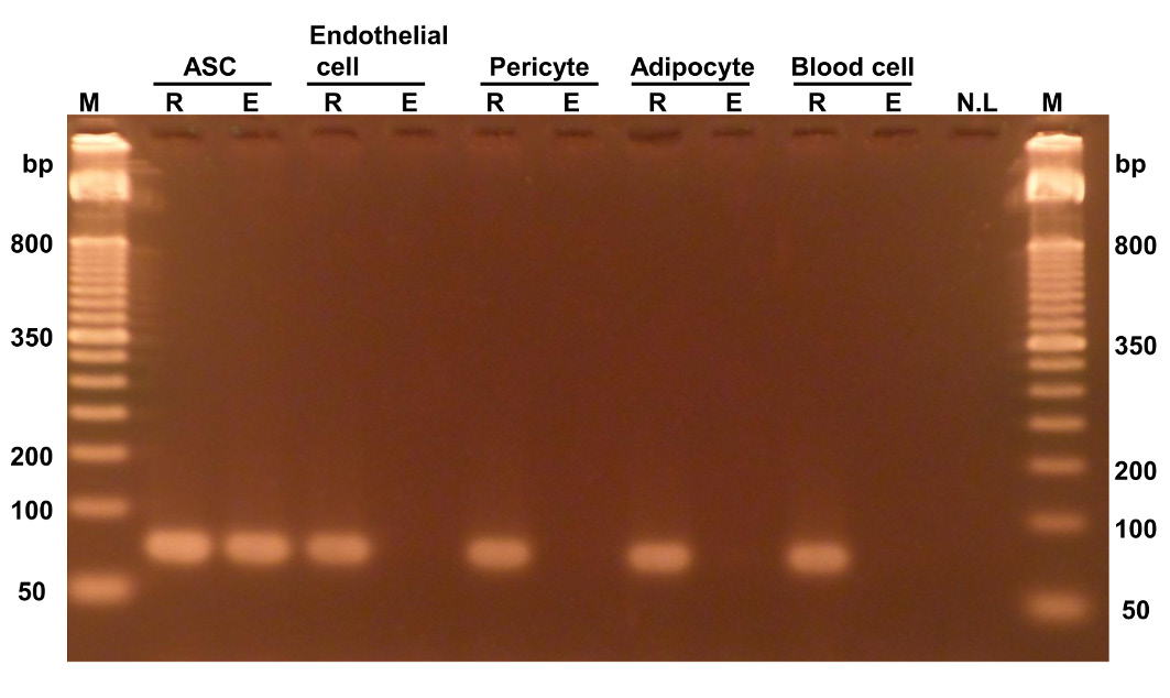 Figure 2. Selective PCR amplification from ASCs with methylated C6th. Genomic DNA extracted from each cell type was treated with either HapII (indicated by E) or no enzyme (indicated by R) and then used for PCR (25 cycles). HUVECs and hPC-PLs were used as surrogates for endothelial cells and pericytes, respectively. M, marker. NL, no load.