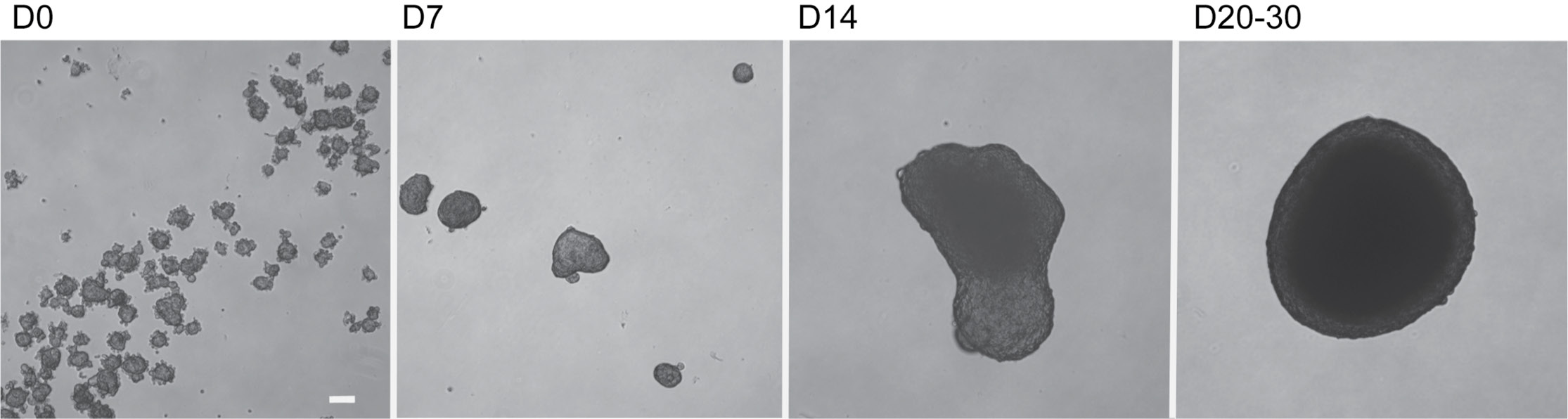 Figure 2. Py8119 mammosphere formation. Py8119 cells were plated at 2.5 × 104 cells/ml in 6-well ultra-low attachment plates and grown for 20–30 d before infiltration with BMM. Developing mammospheres were fed with supplemented Ham’s F12K medium every 7 d. Scale bar = 100 µm.
