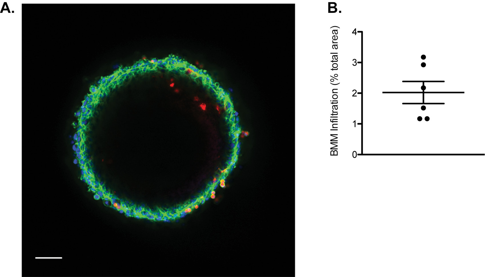 Figure 3. BMMs infiltrate Py8119 mammospheres. A. Py8119 mammospheres were infiltrated with BMM (red) for 3 d. After fixation and staining for F-actin (green), and DAPI (blue), mammospheres were analyzed by Confocal microscopy. Scale bar = 100 µm. B. Using > 3 mammospheres, the degree of infiltration relative to mammosphere area was quantified.