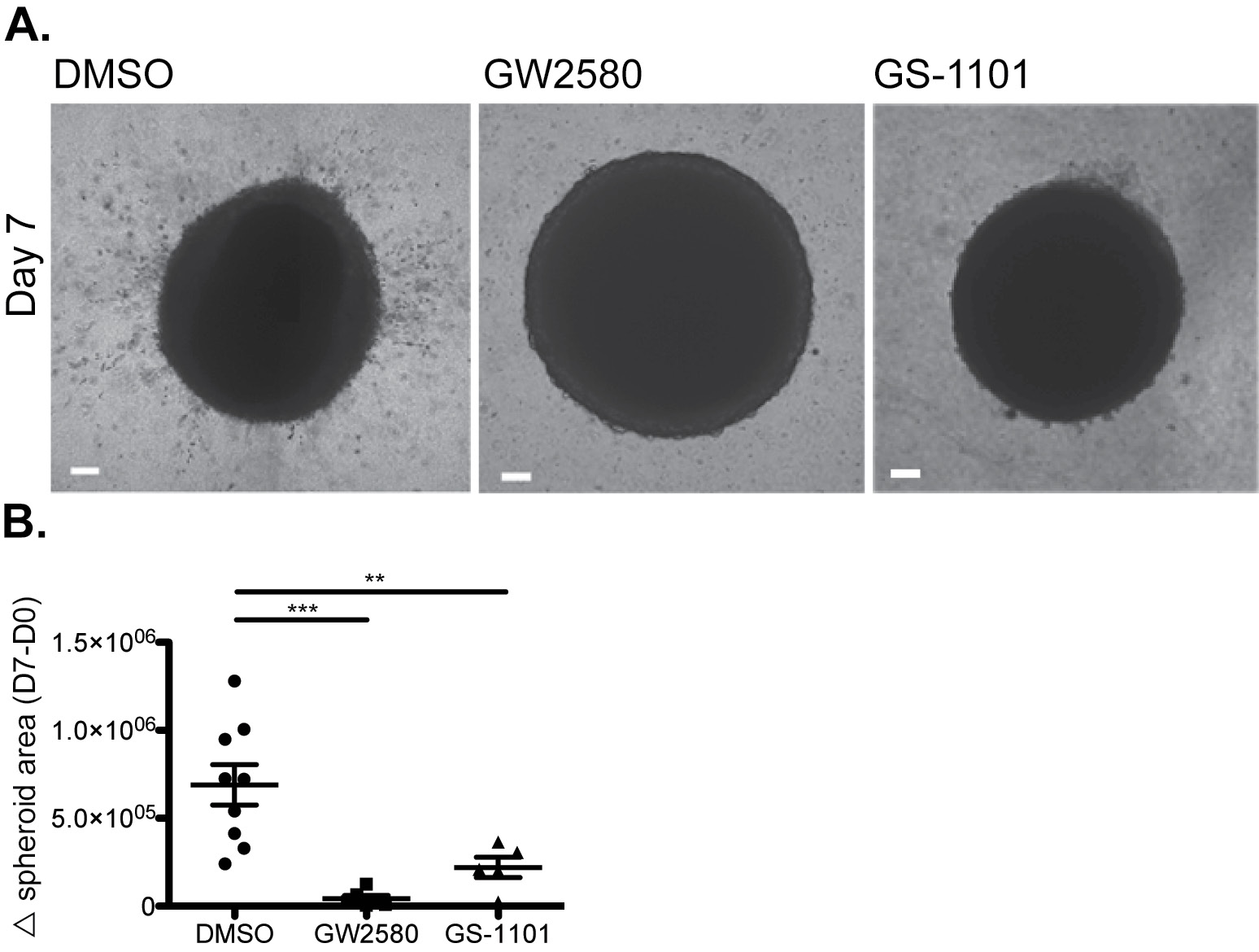 To test our hypothesis that BMM motility regulates tumor cell invasion, we compared the effects of an inhibitor of PI3K p110δ, GS-1101, that blocks macrophage motility [14] with a CSF-1R inhibitor, GW2580, in our mammosphere co-culture model. Consistent with our hypothesis, BMM-infiltrated mammospheres embedded in Matrigel in the presence of either GS-1101 or GW2580 failed to invade the surrounding matrix (Fig. 5). Since PI3K p110δ is a critical mediator of CSF-1-induced macrophage motility, signaling downstream of the CSF-1R is therefore integral to the promotion of tumor cell invasion by BMM. Importantly, although GW2580 blocks all CSF-1R signaling, this treatment did not deplete infiltrating macrophages from the mammosphere co-cultures (data not shown). Furthermore, as PI3K p110 is only expressed in hematopoietic cells such as macrophages, and not tumor cells, GS-1101 specifically targets macrophages in this context [14].