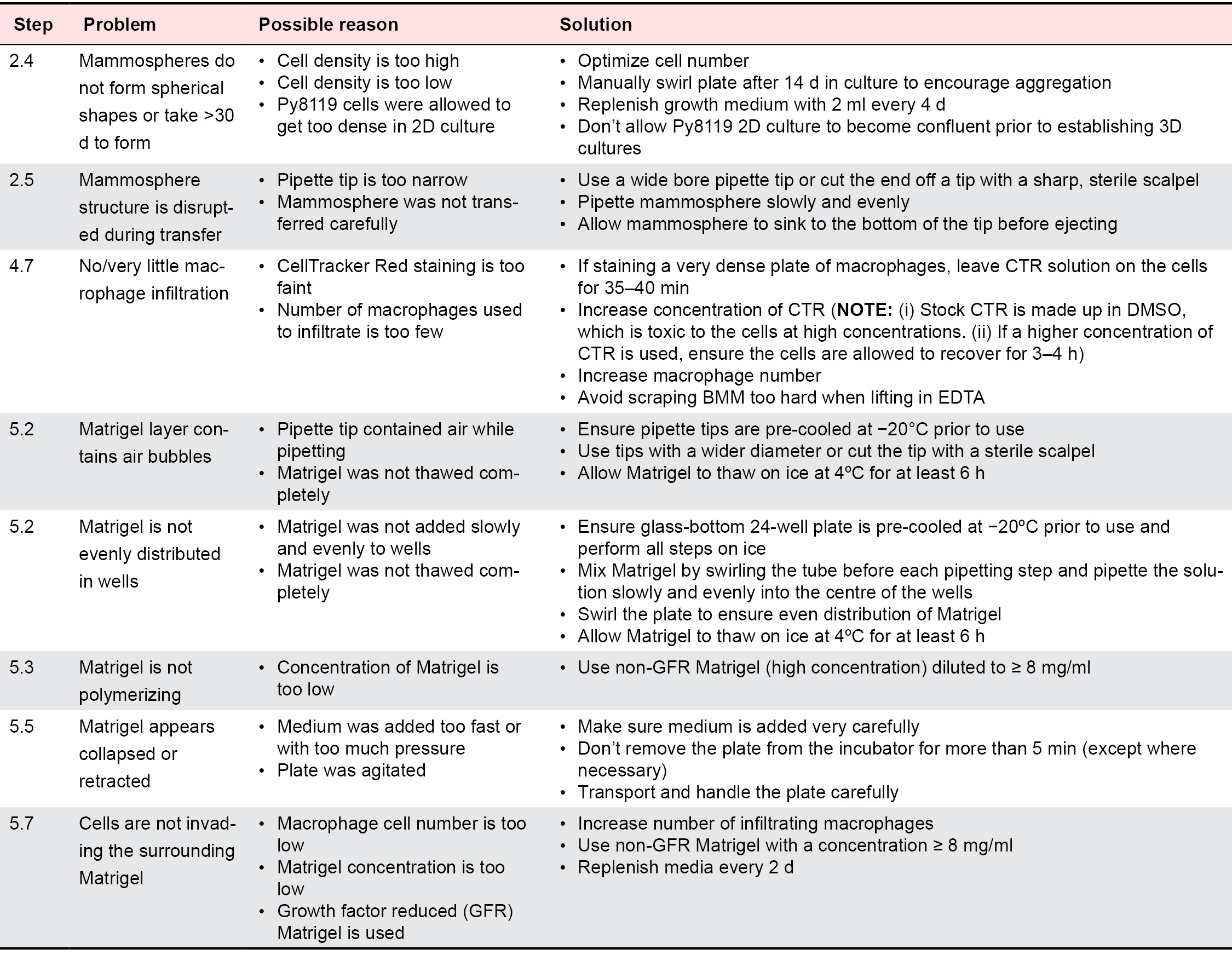 NOTES: (i) Matrigel de-polymerizes after 7 d. (ii) CellTracker Red staining fades after 7 d so confocal images taken of mammosphere invasion into Matrigel should not be used for quantification by immunofluorescence. (iii) Phase contrast images of embedded spheroids should be taken daily from d 0 until the end of the assay at d7. Measurement of the invasive area of cells can then be measured by d 7–d 0. (iv) When using inhibitors, the desired concentration should be added to the Matrigel used to resuspend the mammospheres and to the BMM medium placed on top. Replenish BMM growth medium containing the inhibitors every 2 d. (v) unless fixed prior to flow cytometry analysis, transport cells on ice.