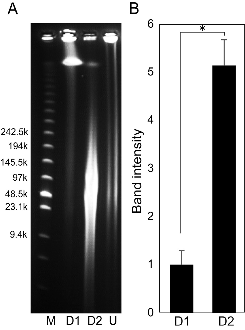 Figure 2. Pulse-field gel electrophoresis analysis of partially digested sperm DNA treated without or with β-mercaptoethanol. A. Agarose plugs treated in the absence (Lane D1) or presence (Lane D2) of β-mercaptoethanol were digested with 6 units of Hind III at 37°C for 20 min. β-mercaptoethanol treatment increased the amount of accessible DNA. Undigested plugs were electrophoresed in Lane U. The low range PFG marker (Lane M) was run alongside with three lanes. B. Relative band intensity of Hind III digested DNA. Band intensity in the gel electrophoresis was measured in the range of 100–500 kbp and compared between the absence (Lane D1) and presence (Lane D2) of β-mercaptoethanol. n = 3, *P < 0.05.