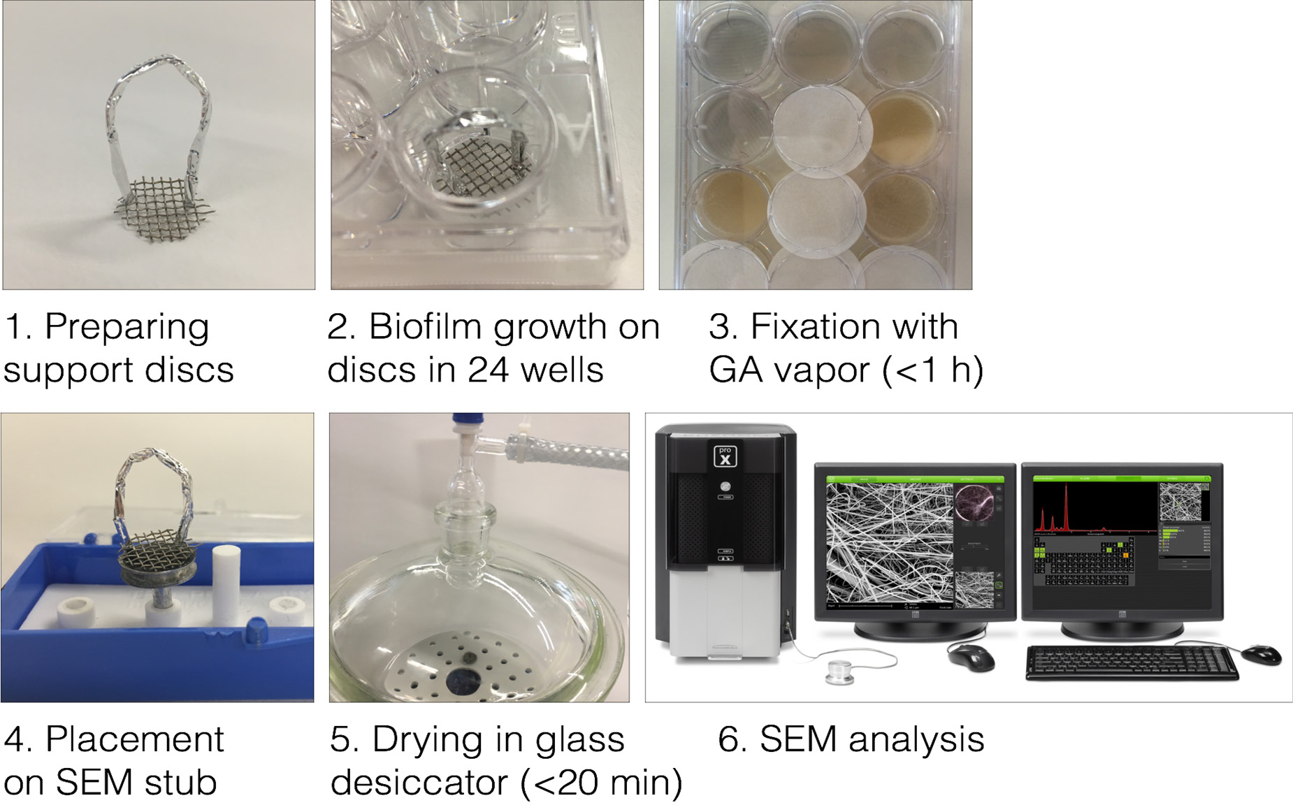 Figure 1. Visual representation of the procedure. Support discs are prepared from commercially available metal nets, with handles fashioned from aluminum wire or foil. The discs are placed in plate wells and sterilized. Fixation is done by placing glutaraldehyde (GA)-soaked filter paper between the plate lid and wells. Support disc with biofilm is placed on SEM stub with handles removed, and placed inside desiccator for drying. Sample is then ready for SEM acquisition and analysis.