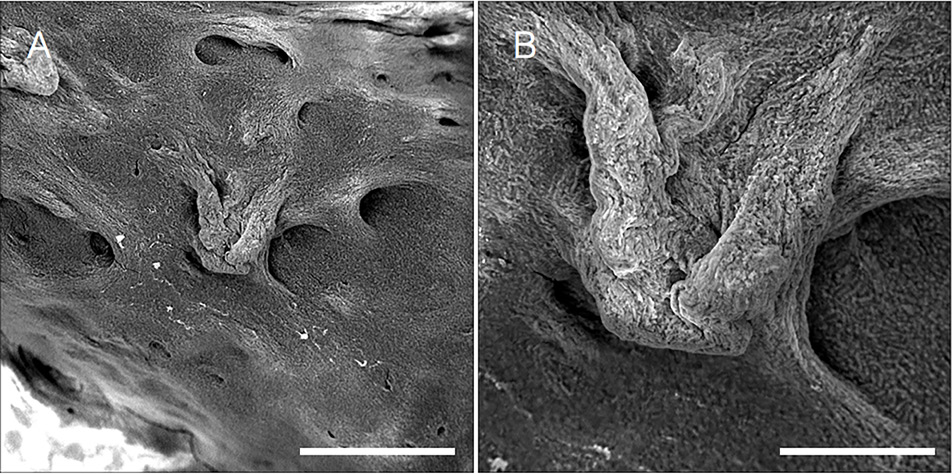 Figure 2. Large and small scale topography of B. subtilis biofilm visualized by native SEM. A. Large scale topography of B. subtilis (Scale bar = 100 µm). B. Small scale topography of B. subtilis (Scale bar = 30 µm). Samples were lifted from medium on support discs, placed onto SEM stubs, dried for up to 20 min, and visualized by SEM.