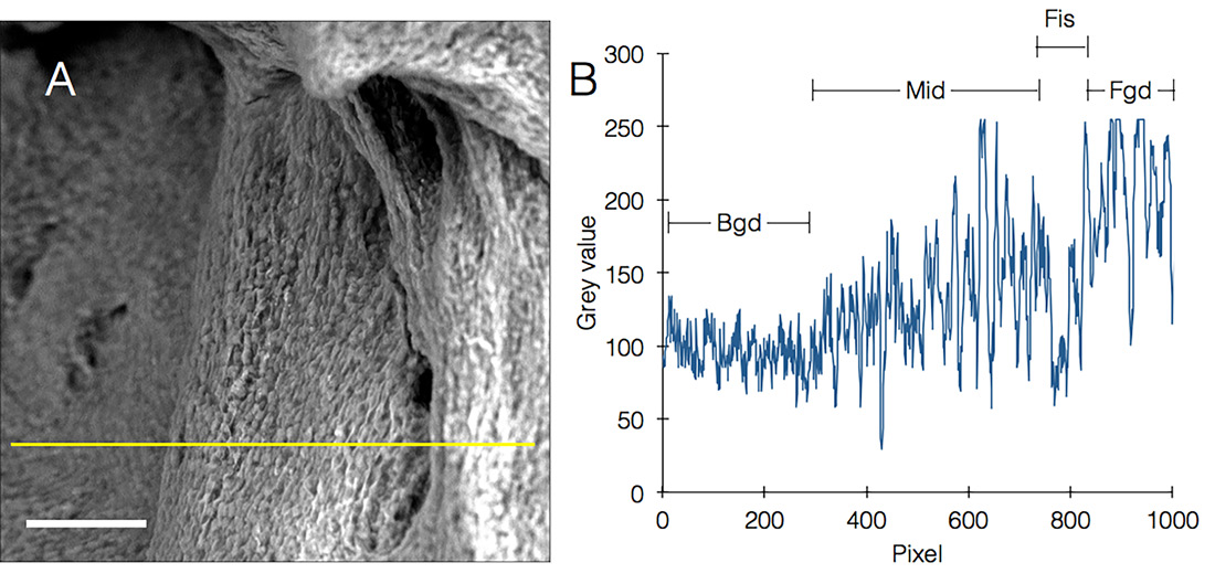 Figure 3. Visualizing and measuring biofilm topography in native SEM. A. Biofilm image acquired by native SEM. Yellow line was drawn for profile plot (B) (scale bar = 10 µm). B. Profile plot from (A), showing all features of the image: Bgd, background; Mid, middle segment, note slope of the mean height of this segment; Fis, fissure; Fgd, foreground segment.