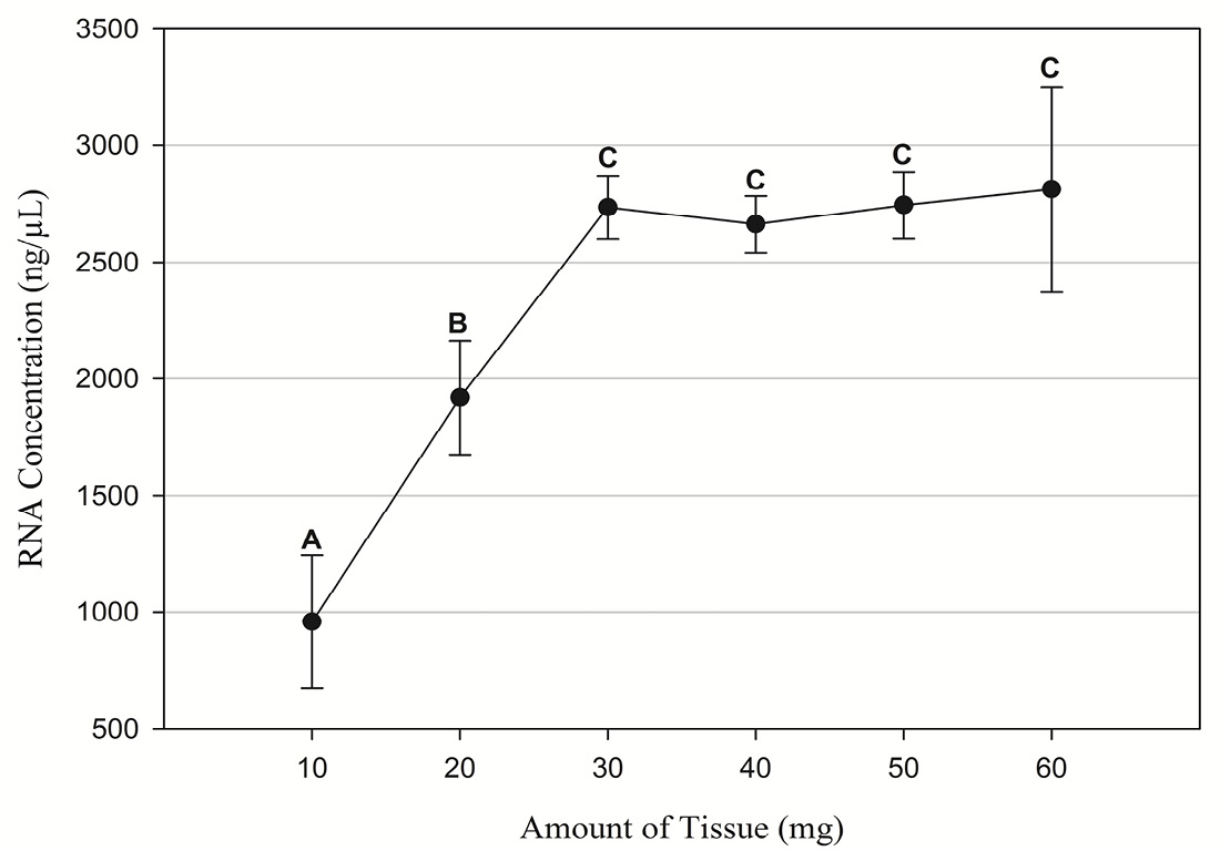 Figure 1. Mean RNA concentration from different initial amounts of tissue. N = 9 samples per extraction procedure. Means with different letters (A, B and C) are significant (P < 0.05).