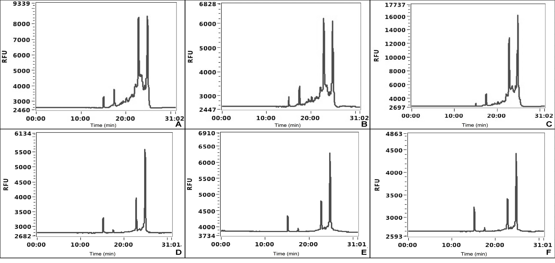 Figure 2. RNA fragment analysis. A-C. Tissues samples 1–3. D-F. Three independent cell cultures.