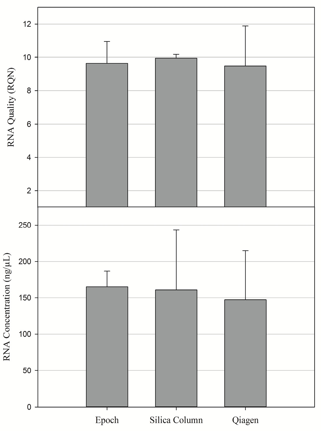 The RNA results comparing the commercial kits to the silica column procedure showed no significant difference in the amount or quality of RNA (Fig. 3 and 4). These results support the claim that the proposed protocol can extract RNA at the same quality and level as the more expensive commercial kits. Although the silica column procedure was effective in extracting pure and consistent RNA, our data suggests that there is a binding limit. After approximately 30 mg of tissue, additional material did not significantly affect the amount of RNA extracted (Fig. 1).