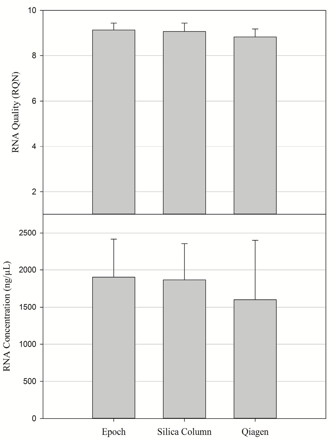 Figure 4. Mean concentration and quality of RNA from different tissue extraction procedures. N = 12 samples per extraction procedure.