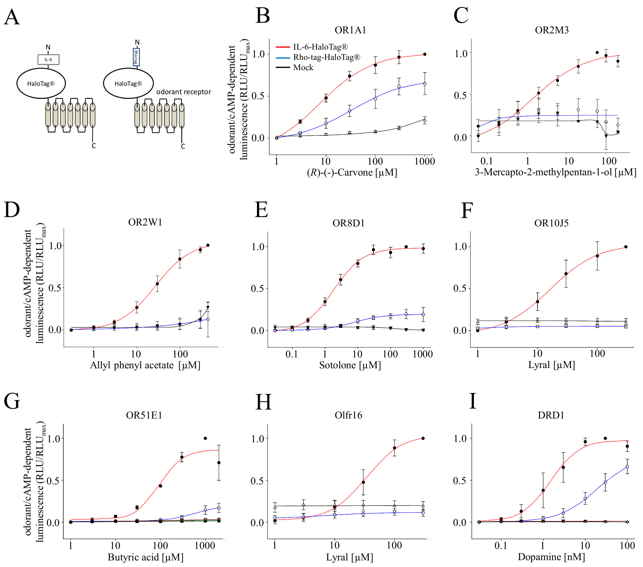 Figure 1. Concentration-response relations for selected odorant/OR combinations with different N-terminal tags in NxG 108CC15 cells. A. Schemes of receptor constructs, carrying either IL-6-HaloTag or Rho-tag-HaloTag. B. OR1A1 with (R)-(-)-carvone. C. OR2M3 with 3-mercapto-2-methylpentan-1-ol. D. OR2W1 with allyl phenyl acetate. E. OR8D1 with sotolone. F. OR10J5 with lyral. G. OR51E1 with butyric acid. H. Olfr16 with lyral [29]. I. DRD1 with dopamine. EC50 values (Table 1) were derived from fitting a function to concentration-response data by means of non-linear regression. Shown are mean ± SD (n = 3–5). Data were normalized to each receptor’s maximum amplitude with the N-terminal tag IL-6-HaloTag. Red colored curves indicate receptors with the N-terminal tag IL-6-HaloTag, blue with Rho-tag-HaloTag, and black curves indicate the empty plasmid control (Mock).