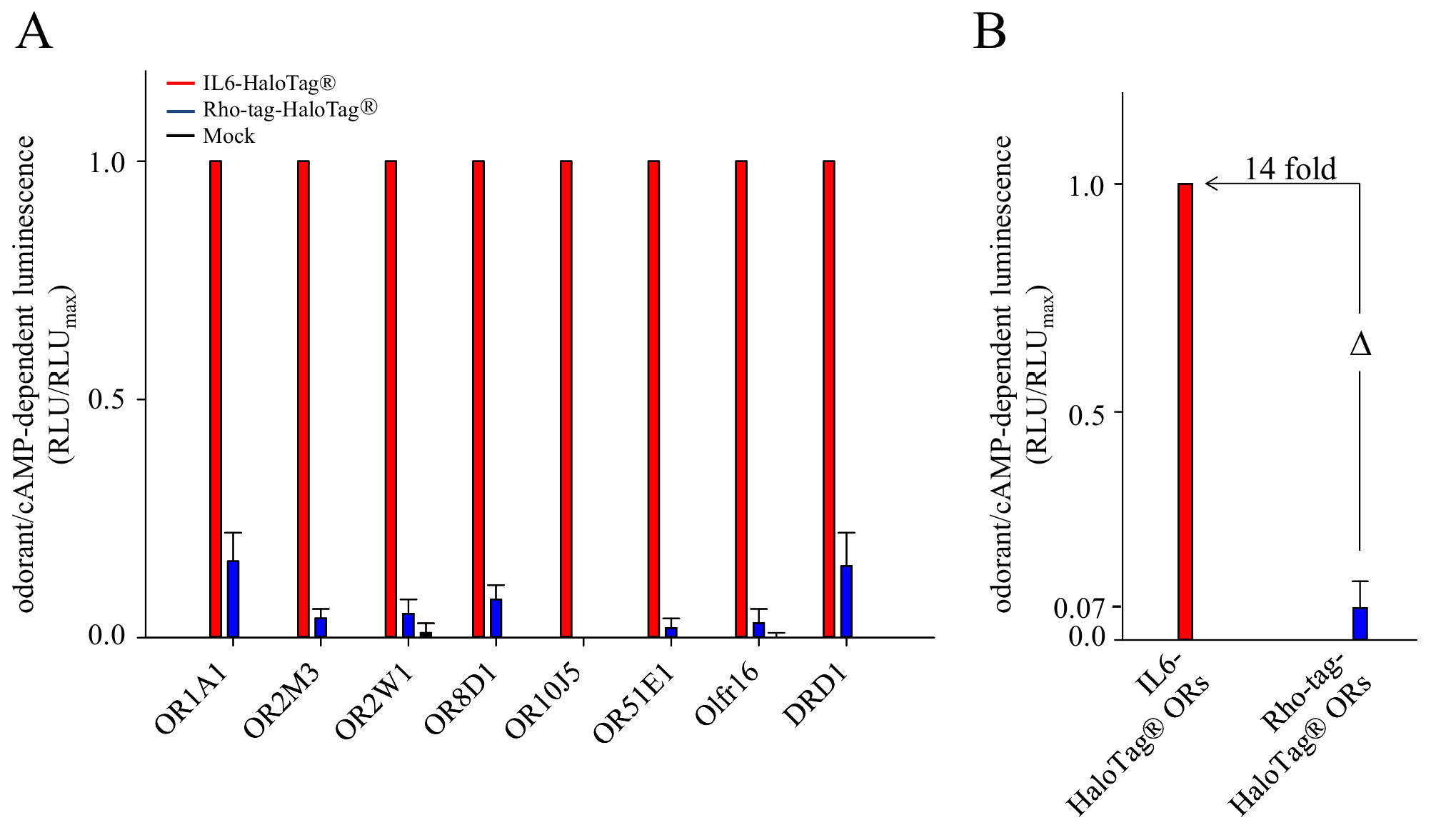 Figure 2. Normalized efficacies of receptors carrying the epitope tags IL-6-HaloTag or Rho-tag-HaloTag in HEK-293 cells. A. Shown are the normalized amplitudes of receptors carrying either the IL-6-HaloTag (red bars) or the Rho-tag-HaloTag (blue bars), when challenged with their reported agonist: OR1A1 with (R)-(-)-carvone (1000 µM); OR2M3 with 3-mercapto-2-methylpentan-1-ol (60 µM); OR2W1 with allyl phenyl acetate (300 µM); OR8D1 with sotolone (300 µM); OR10J5 with lyral (300 µM); OR51E1 with butyric acid (300 µM); Olfr16 with lyral (300 µM); and DRD1 with dopamine (10 nM). Shown are means ± SD (n = 3). Data were normalized to each receptor’s maximum amplitude with the N-terminal tag IL-6-HaloTag. Mock, empty plasmid control (black bars). B. Shown are differences in odorant responses averaged over all tested ORs carrying either the IL-6-HaloTag (red bar) or the Rho-tag-HaloTag (blue bar).