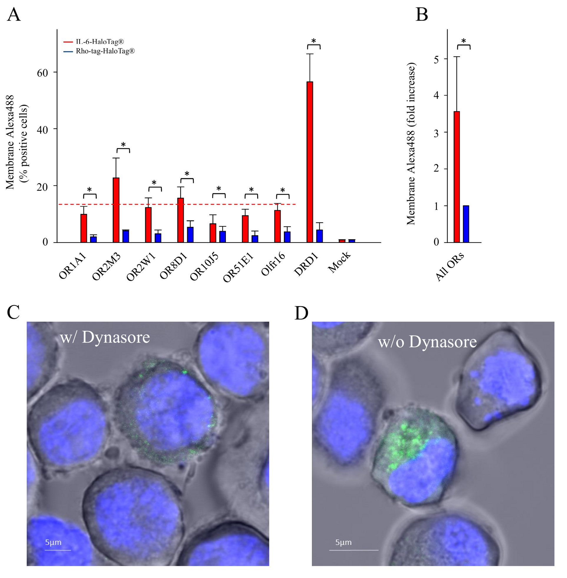 Figure 3. Analysis of the cell surface expression of investigated ORs with both N-terminal tags. A. Flow cytometry analysis of transiently transfected NxG 108CC15 cells showing a detectable fluorescence of membrane-impermeable HaloTag Ligand-Alexa488, suggesting different cell surface expression of ORs carrying different N-terminal tags. Data are means ± SD (n = 3–6). Mock, empty plasmid control. *P < 0.05 as compared to Rho-tag-HaloTag. B. Differences averaged over all tested ORs, carrying either the IL-6-HaloTag (red bar), or the Rho-tag-HaloTag (blue bar), and normalized to the Rho-tag-HaloTag ORs. *P < 0.05 as compared to Rho-tag-HaloTag. C. Fluorescence confocal image of NxG 108CC15 cells expressing IL-6-HaloTag-OR8D1, labeled with membrane-impermeable HaloTag Ligand-Alexa488, and treated with endocytosis blocker Dynasore. D. Fluorescence confocal image of NxG 108CC15 cells expressing IL-6-HaloTag-OR8D1, labeled with membrane-impermeable HaloTag Ligand-Alexa488, but without endocytosis blocker Dynasore.