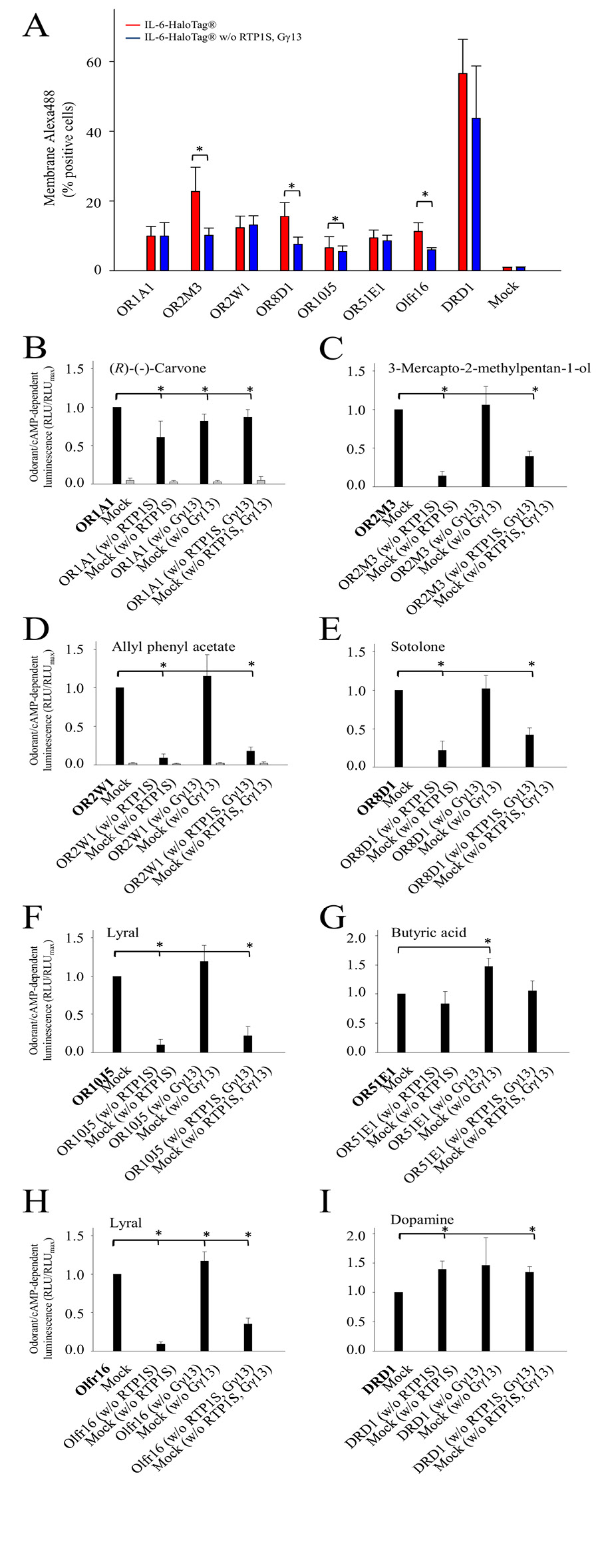 Figure 4. The influence of accessory proteins on the OR cAMP signaling in NxG 108CC15 cells. Flow cytometry analysis of the cell surface expression of investigated ORs (A). The data represent the percentage of NxG 108CC15 transiently transfected cells with a detectable membrane-impermeable HaloTag Ligand-Alexa488-dependent fluorescence, suggesting cell surface expression of OR, as determined by flow cytometry. Red bars indicate the transfection with all accessory proteins and blue bars indicate the transfection without (w/o) RTP1S and G13. Shown are mean ± SD (n = 36). Mock, empty plasmid control. cAMP-luminescence measurements of OR1A1 with (R)-(-)-carvone (1000 µM) (B), OR2M3 with 3-mercapto-2-methylpentan-1-ol (60 µM) (C), OR2W1 with allyl phenyl acetate (300 µM) (D), OR8D1 with sotolone (300 µM) (E), OR10J5 with lyral (300 µM) (F), OR51E1 with butyric acid (300 µM) (G), Olfr16 with lyral (300 µM) (H), and DRD1 with dopamine (10 nM) (I). All receptors were tagged with IL-6-HaloTag. Data were normalized to each receptor with co-transfection of RTP1S and G13. Shown are mean ± SD (n = 3). Black bars are receptor responses in the presence of RTP1S and G13, and grey bars indicate empty plasmid control (Mock). *P < 0.05 as compared to receptor responses in the presence of RTP1S and G13.