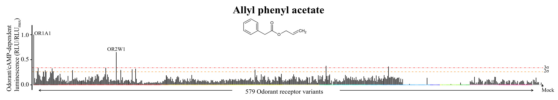 Figure 5. Allyl phenyl acetate at 100 µM activates two receptors out of 579 odorant receptor variants. Screening of allyl phenyl acetate (100 µM) against 579 OR variants in NxG 108CC15 cells. Data (n = 1 in duplicates) were normalized to the maximum responding OR (OR1A1). OR families are color-coded and sorted in ascending numerical order. Dashed lines indicate 2- and 3σ-thresholds. Mock, empty plasmid control.