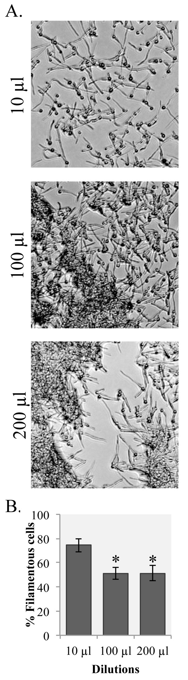 Figure 1. Plating density impacts filamentation. Washed overnight cultures of wild type C. albicans strain SC5314 were spread onto RPMI-MOPS plates at the indicated volumes. For volumes less than 200 µl, sterile water was added to the surface of the plate to bring the plating volume to 200 µl. Images are representative pictures from three independently-tested plates. A. The plates were allowed to incubate at 37°C for 3 h and cells were then imaged on the plate surface. B. The percentage of filamentous cells was calculated for each dilution by averaging filamentous cells recovered from three agar plates. Error bars represent standard error from the mean. Starred values are significantly different from the 10 µl dilution (P < 0.01) as measured by a Student’s t-test.