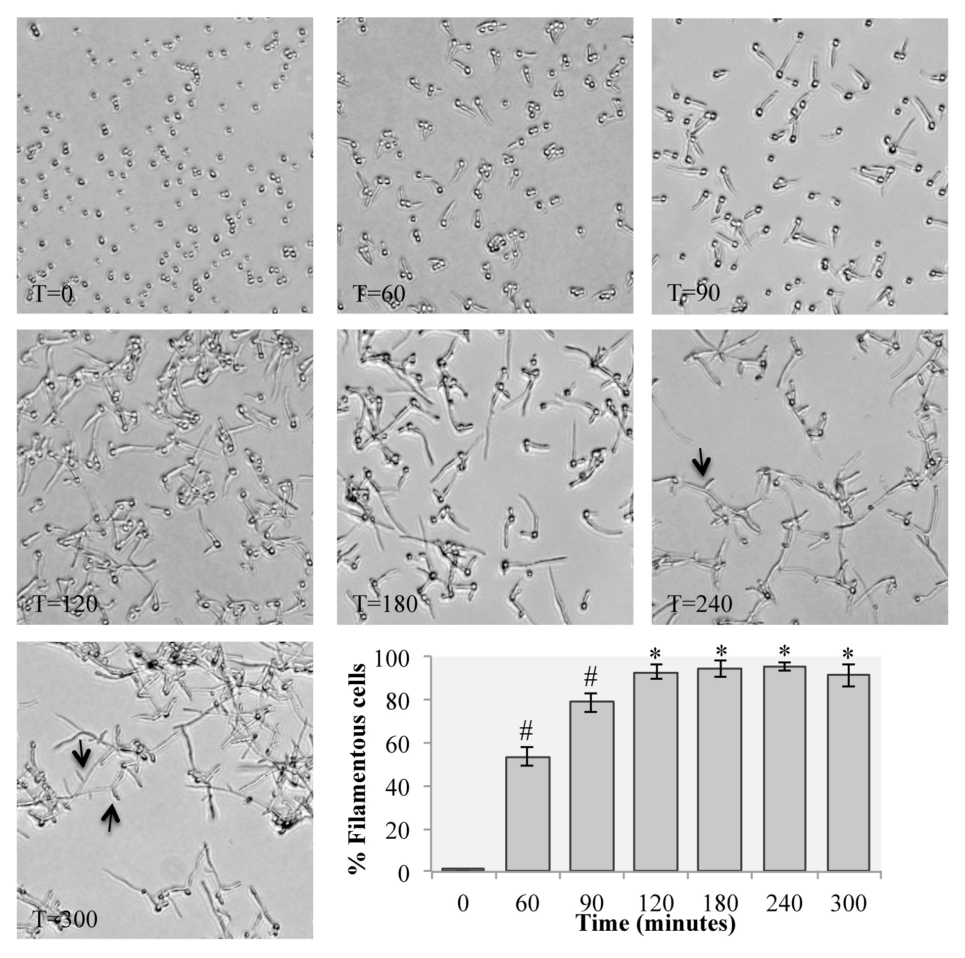 Figure 2. Filament development over time on solid agar plates. Ten µl of washed overnight cultures of wild type C. albicans strain SC5314 were spread onto RPMI-MOPS plates and incubated at 37°C for the indicated times (in minutes). Arrows at 240 and 300 min indicate branching of the filamentous cells. The inset graph represents the percentage of filamentous cells at each time point that were counted on from images taken from 3 plates. Starred values are significantly different from the 0 time point (P < 0.001) as measured by a Student’s t-test. Hash-marked values are significantly different from the 0 time point and from the previous time point (P < 0.005).