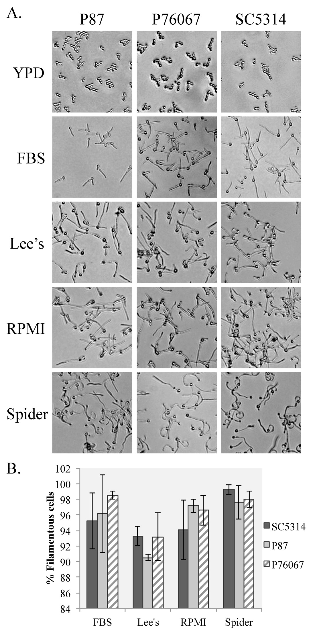 Figure 3. Divergent C. albicans wild type strains exhibit distinct filamentation phenotypes on inducing media. A. Washed overnight cultures of wild type C. albicans strains P87, P76067, and SC5314 were spread onto inducing media (FBS, Lee’s, RPMI, and Spider) and the non-inducing media c(YPD). Plates were incubated for 180 min at 37°C for the inducing media and 30°C for the non-inducing media and then imaged. B. The percentage of filamentous cells was calculated for each strain by averaging filamentous cells recovered from three agar plates. Error bars represent standard error from the mean. No values had a statistically significant difference from the SC5314 value measured within the same condition.