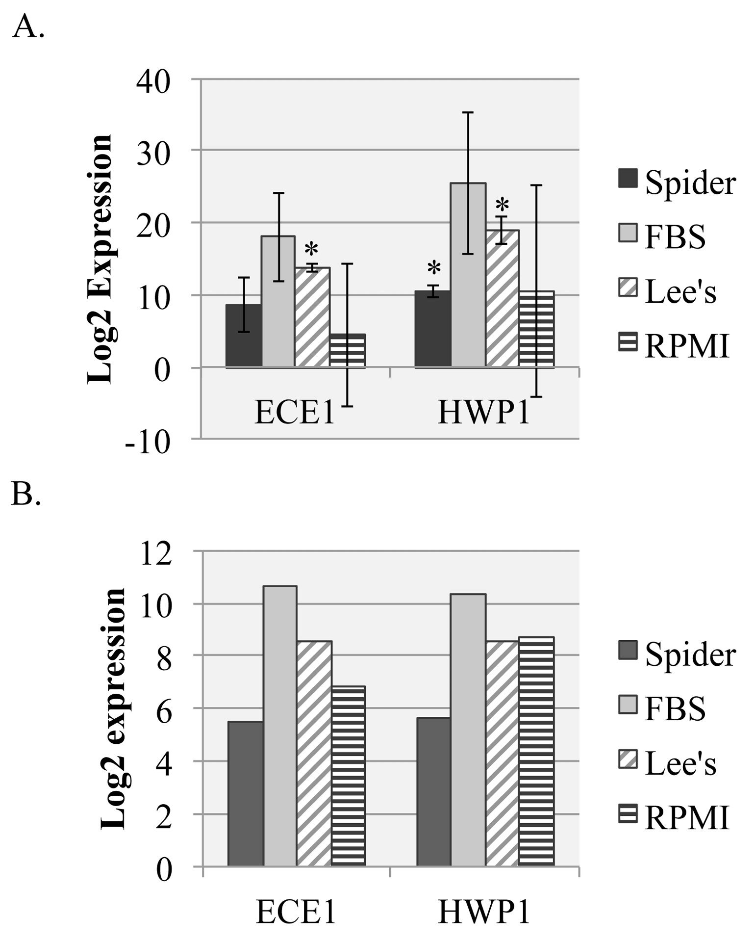 Figure 4. qRT-PCR and RNAseq expression analysis of hyphal-specific genes. A. The expression of hyphal-specific genes ECE1 and HWP1 in SC5314 cells grown on spider (dark bars), 10% FBS (light bars), Lee’s (diagonal striped bars), or RPMI (horizontal striped bars) solid media were examined by qRT-PCR. TDH3 (not shown) was used as to normalize gene expression between samples and expression of cells grown in YPD at 30°C was used as a normalizing condition. Error bars represent standard deviation from the mean of three biological replicates. Starred values are significantly different from the control strain (P < 0.05) as measured by a Student’s t-test. B. The expression of hyphal-specific genes ECE1 and HWP1 in SC5314 cells grown on the indicated solid media were examined by RNAseq analysis. Expression levels for each sample were normalized to expression levels in cells grown in YPD at 30°C. Samples were tested in biological triplicates. All samples were significantly different from control values (P < 0.001).