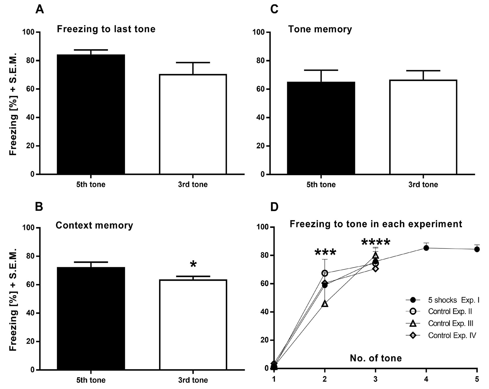 Figure 1. Experiment I. Three tone-cue/shock pairings revealed comparable freezing behavior to five tone-cue/shock pairings at the end of acquisition with slightly significant effect in contextual memory. A. Freezing to the 5th tone-cue (black bar) during acquisition revealed no significant difference to 3rd tone-cue (white bar). B and C. Compared with the five-pairs-group, the three-pairs-group froze significantly less during re-experience of the learned context seven days after acquisition (B) but not to the tone-cue (C) eight days after acquisition. D. Comparison between the five-pairs-group of experiment I (black circles, N = 8) and the controls of the following experiments II (empty circle, N = 8), III (triangle, N = 7) and IV (square, N = 8). All groups showed increased freezing to the second and third tone-cue compared with their respective first tone-cue, whereas the acquisition levels are comparable between the different experiments after the first three tone-cue presentations. Delivered foot shocks: 1 mA for 2 s after an ISI of 2 s. *P < 0.05, ***P < 0.001, ****P < 0.0001.