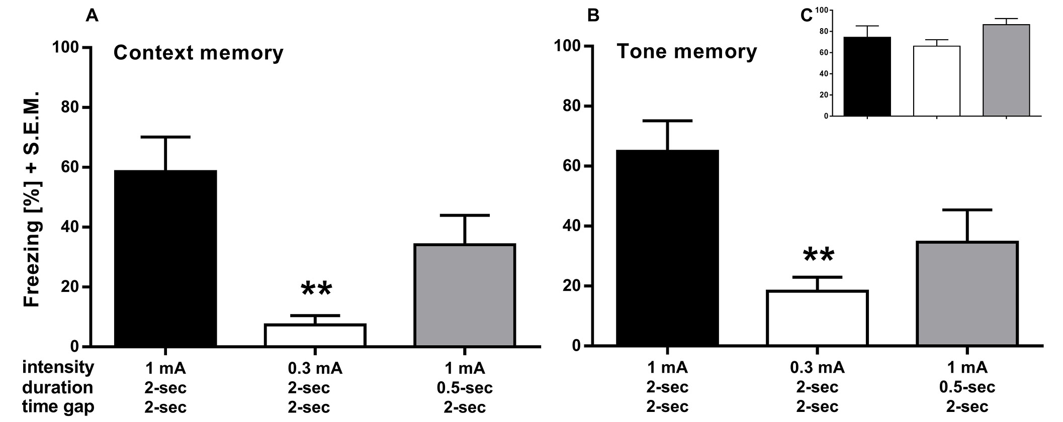 Figure 2. Experiment II. Contextual and cue memory is significantly decreased with delivered foot shocks of only 0.3 mA current strength during acquisition. A and B. The 0.3 mA group froze significantly less to the learned context seven days (A) and to the learned tone eight days (B) after acquisition. C. Freezing to the last tone during acquisition. Control group (black bar) received 3 foot shocks (1 mA for 2 s) after an ISI of 2 s between tone and shock whereas the other groups differed in the designated parameter. **P < 0.01.