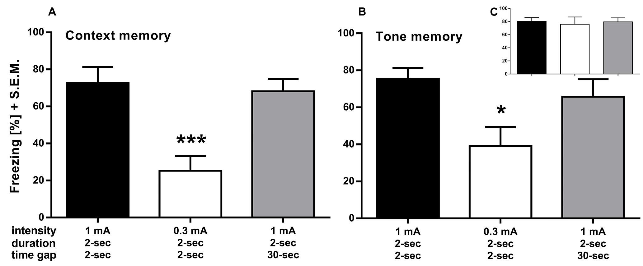 Combining the constant shock intensity of 1 mA with a shock duration of either 2 s or 0.5 s, we noticed no impact of the shorter shock duration on freezing level to both context and tone-cue presentation during retention trials. However, animals that received a combination of the low intensity 0.3 mA shock with the short 0.5 s duration failed to acquire the tone-cue/US association during the training phase. We consider it likely that the lack of acquired tone-cue/US pairing also represents an insufficient pairing of context/US stimuli as well. Therefore, using this combination might not establish memory acquisition in the first place. Consequently, this constellation was not considered for subsequent analysis.
