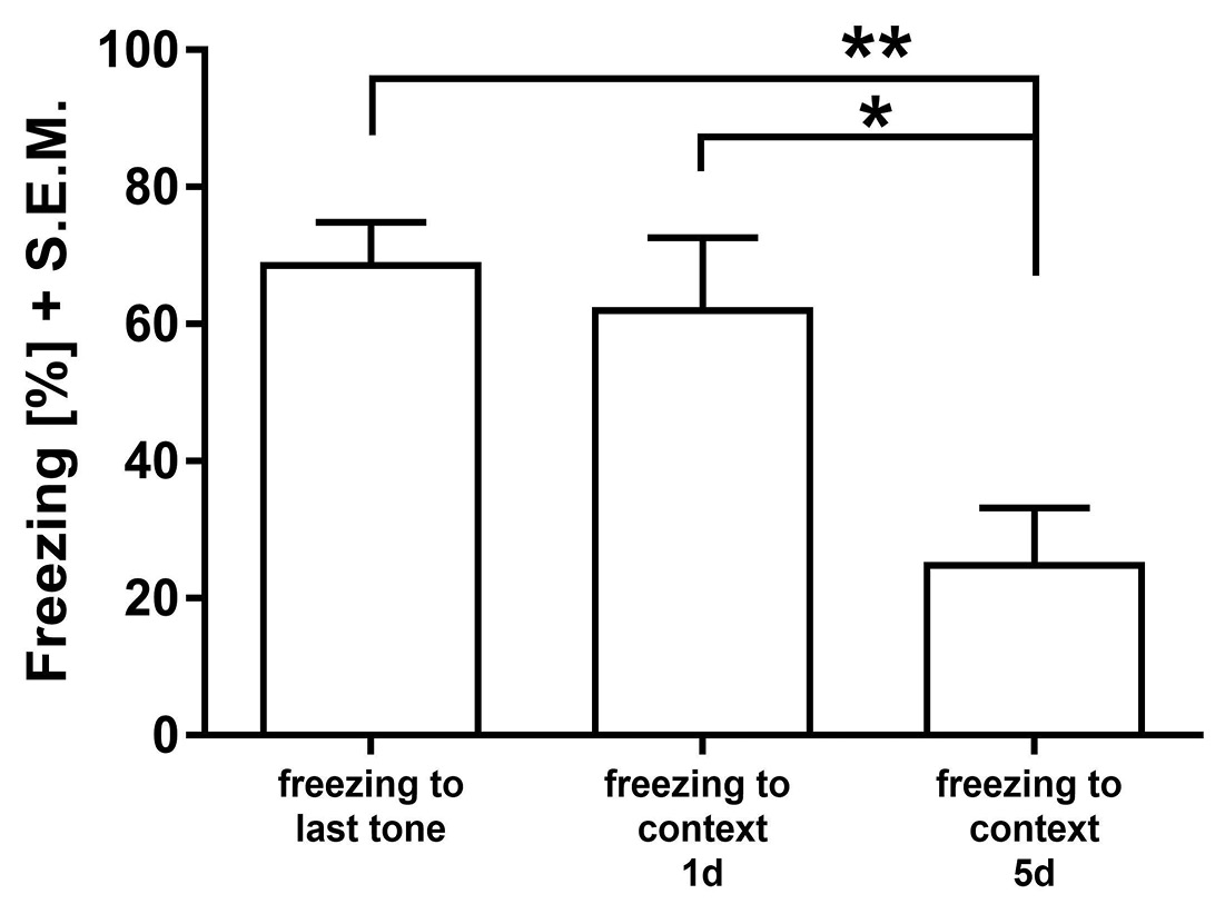 Figure 5. Freezing during acquisition is reflected in contextual memory in time-different manner. In a study of two distinct groups receiving three CS/US pairings with foot shocks of 0.3 mA memory for context was retained one day after training but forgotten 5 d after training. *P < 0.05, **P < 0.01.