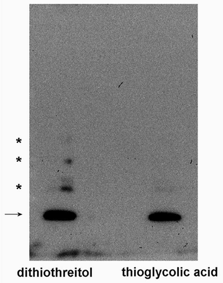 In Figure 1, we disclosed that recombinant human MsrB1 (carrying a cysteine instead of the selenocysteine) when reduced with dithiothreitol and subjected to SDS-PAGE and Western blotting, shows a main band at the apparent molecular mass of 13 kDa. However, other, less intense bands are also visible, which most likely represent protein aggregates with molecular masses of about 25, 40 and 50 kDa (supposedly dimeric, trimeric and tetrameric forms of MsrB1). The use of thioglycolic acid instead of dithiothreitol completely suppresses the formation of these extra bands, clearly indicating that this phenomenon occurs during electrophoresis and involves cysteine oxidation.