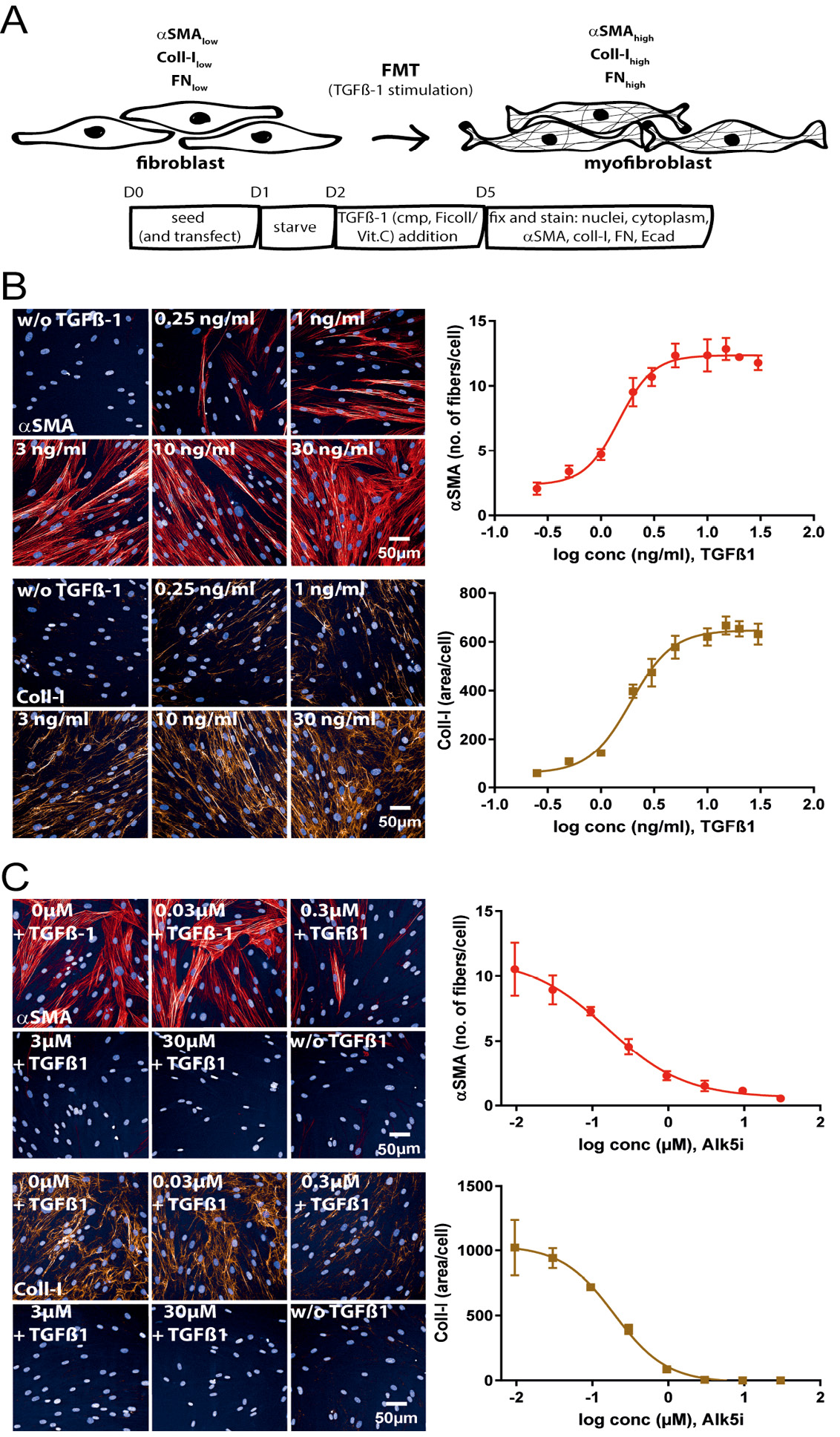 29]. In the present study, we described a further optimized version of this assay, not only measuring aSMA as marker of myofibroblast formation, but also including ECM components, collagen-I and fibronectin as readouts. In addition, we delineated an EMT assay with E-cadherin as a readout. In combination with pharmacological and genetic methods, these assays are useful tools for compound characterization, target identification and validation in a higher throughput format. We showed that both assays exhibit a dose dependent responsiveness to TGFβ-1 and are pharmacologically modulated by TGFβ-1 receptor inhibitors (Alk5 inhibitor, Alk5i). In addition, they are compatible with siRNA and Cas9-RNP transfections to study gene function.