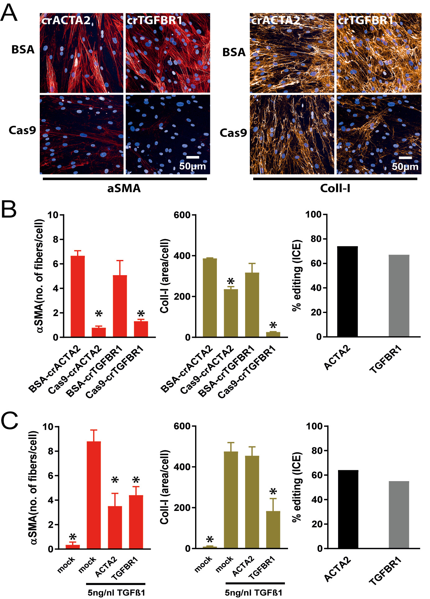 Figure 4. Crispr-Cas9 mediated knock out of ACTA2 and/or TGFBR1 in the FMT assay. A. NHLF cells were transfected with Cas9-cr:trRNA-RNPs targeting ACTA2 (crACTA2) and TGFBR1 (crTGFBR1). ACTA2 and TGFBR1 knock out reducedαSMA expression, whereas Coll-I expression was diminished only by Cas9-RNPs targeting TGFBR1, but not ACTA2. B. Quantitative analysis of images shown in (A) (right and middle) and editing efficiency calculated in ICE (left). Editing efficiencies for ACTA2 and TGFBR1-RNP are both > 80%. *P < 0.05 versus BSA-crRNA transfected cells. C. ACTA2 and TGFBR1 cr:trRNA transfection in NHLF cells constitutively expressing Cas9. In contrast to TGFβ-1-treated NHLF cells, mock transfected NHLF cells without TGFβ-1 are devoid of αSMA and Coll-I expression. ACTA2- and TGFBR1-cr:trRNA transfection reduced αSMA expression less than the corresponding Cas9-RNP transfections. Again Coll-I expression was not affected by an ACTA2 knock out. TGFBR1-cr:trRNA transfection diminished Coll-I expression (right and middle). Editing efficiencies are at least 50% in Cas9 expressing cells, which is lower as in Cas9-RNP transfected cells. *P < 0.05 versus mock transfected cells treated with TGFβ-1.