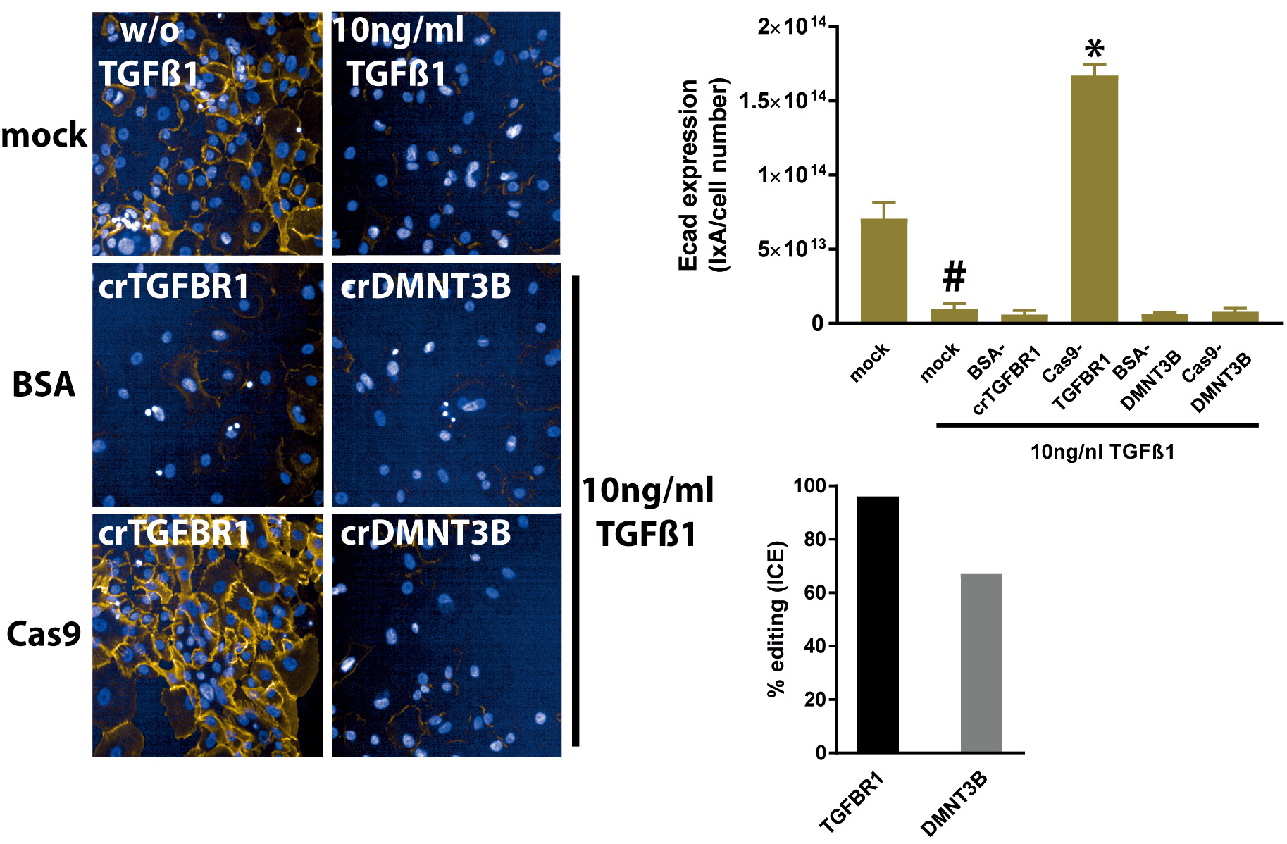 Figure 5. Crispr-Cas9 mediated knock out of TGFBR1 and DMNT3B in the EMT assay. hSAECs were either mock transfected (Cas9 replaced by BSA) or with Cas9-cr:trRNA-RNPs targeting TGFBR1 (crTGFBR1) and DMNT3B (crDMNT3B). In mock transfected cells TGFβ-1 repressed Ecad expression. TGFBR1 knock out abolished Ecad repression completely, whereas a DMNT3B knock out did not alter Ecad expression. Editing efficiency for TGFBR1- and DMNT3B-RNPs were at least 60%. *P < 0.05 versus BSA-crRNA transfected cells, #: mock transfected, TGFβ-1 treated versus mock-transfected non-TGFβ-1-treated cells.