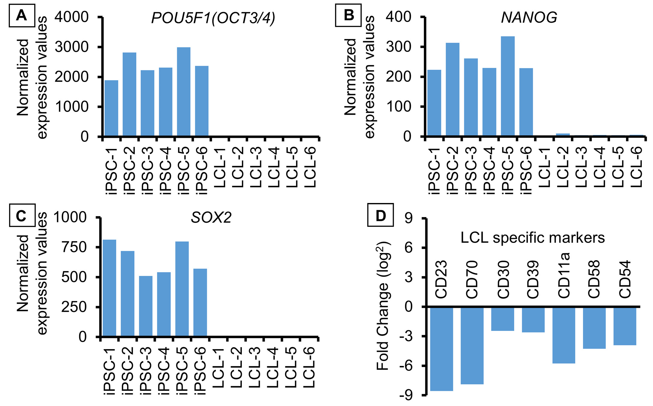 Figure 3. Differential gene expression analysis of pluripotency and LCL specific markers in LCL and their reprogrammed iPSCs. A-C. Graphs showing gene expression of core pluripotency markers (POU5F1, NANOG, SOX2) in LCLs and their reprogrammed iPSCs. D. The differential gene expression graph showing significant down-regulation of LCL specific markers (CD23, CD70, CD30, CD39, CD11a, CD58 and CD54).