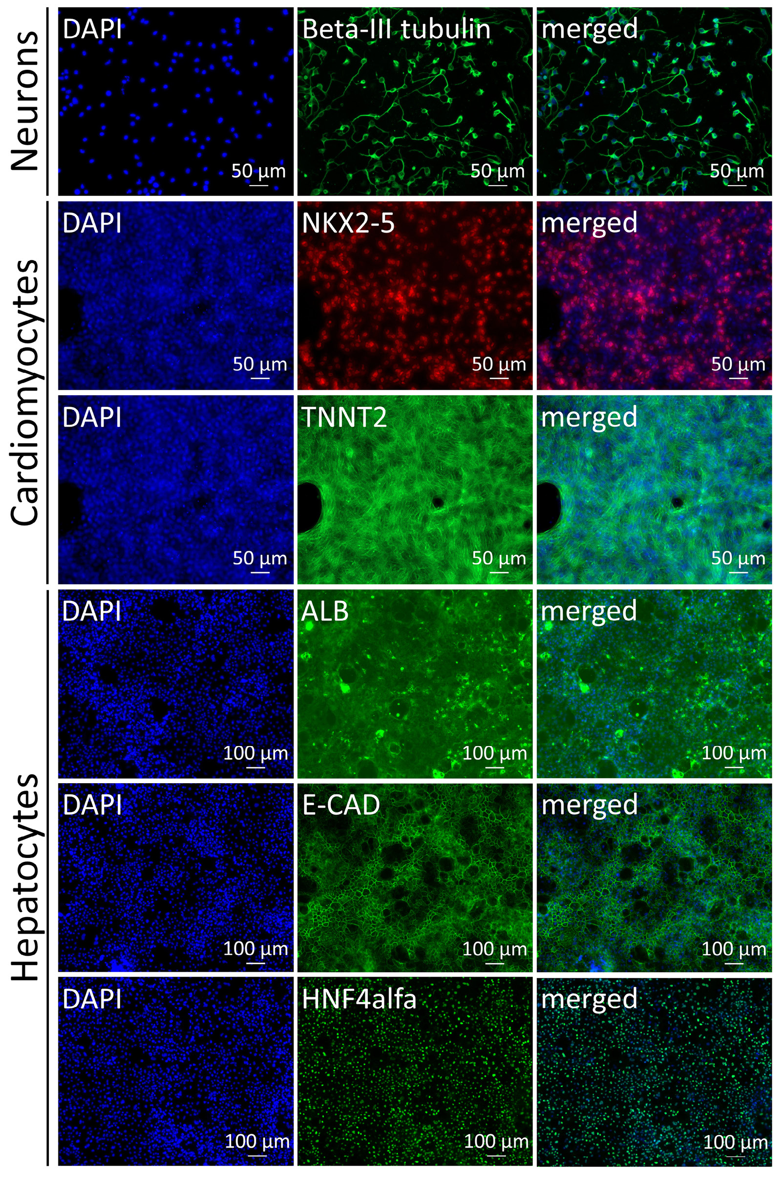 Figure 5. Generation of terminally differentiated cells of all the three germ layers from LCL reprogrammed iPSCs. Immunocytochemistry analysis of neurons (ectoderm), cardiomyocytes (mesoderm) and hepatocytes (endoderm) differentiated from LCL reprogrammed iPSCs.
