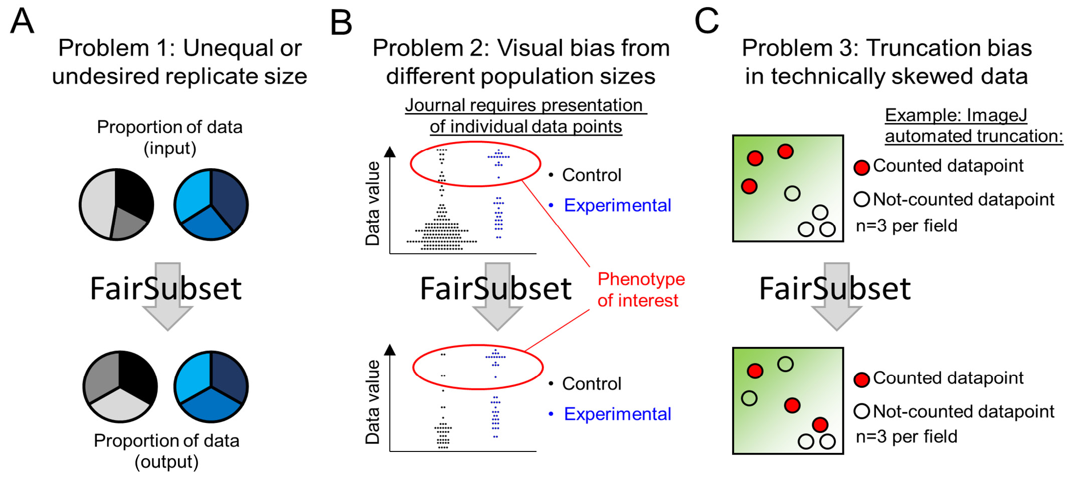 Figure 1. Examples of uses for FairSubset. A. A common problem of automated data acquisition methods is that they do not always allow for an equal number of outputs. Yet it is often desirable to have an equal number of data points between replicates or samples. FairSubset provides an automated method to find which equal N subsets best represent the original data in an unbiased fashion. B. One case in which equal subsets may be desired are experiments in which the control group and experimental group have substantially different N and the phenotype of interest is a rare event. Plotting raw data may produce a visual bias wherein the experimental ratio of the rare event appears less skewed than the data would suggest. In this unique scenario, FairSubset may be considered as a standard to identify subsets for rigorous visual presentation. These individual points may then be overlaid with a violin plot or a boxplot for optimal presentation value. C. Automated imaging is an example where choosing the first set of data points (automated truncation of 20 cells per image, for example) may yield bias sample-to-sample. There are often technical artifacts, sometimes invisible to the naked eye but not to quantitation software, where a portion of the field of view has increased or decreased intensity values. Depending on where the regions of interest (e.g., cells or nuclei) are found in individual images, this may skew the data for images with higher density of regions of interest. FairSubset can be used without knowledge of biased intensity regions to consistently save data from a defined N per image without such skewing of the data. For (B-C), these are proposed uses, but additional uses of fairly subsetting identical N per replicate or sample are likely to be spread throughout science.