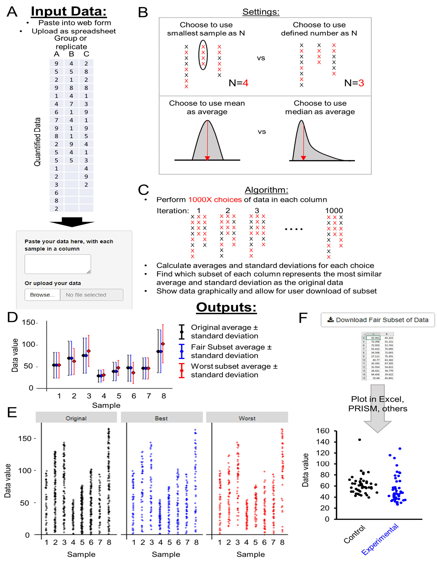 Figure 2. Inputs, outputs, and algorithm of FairSubset. A. Input data is pasted into the free text box or uploaded as a spreadsheet (.tsv, .csv, or .txt). Data must have each control, experimental condition, or sample replicate separated in columns. Rows must contain the quantified data. B. Adjustable settings allow for using either the lowest N sample or a defined N subset. This is useful to choose to use either the most data or a convenient and consistent sample size. The user can decide to use mean or median as the average criterion, or a more advanced Kolmogorov–Smirnov test for skewed data. C. Diagram of method underlying FairSubset calculations. 1000 random choices of subset are made for each sample (colored red). Standard deviations and averages are calculated for each random subset. Whichever subset has the most similar standard deviation and average as the original sample is then marked as the Fair Subset. These data are the most representative of the sample. Conversely, the worst subset is that in which the average and standard deviation are most different from the original sample and represents the worst-case scenario for what could have happened by randomly choosing points. D. Plot output showing the mean and standard deviation of original (black), Fair Subset (blue), or the worst subset (red) within 1000 tested subsets. E. Output graphically depicting how individual data may be plotted for original (black), Fair Subset (blue), or the worst subset (red) within 1000 tested subsets. This is a first-pass check on the subsetting method’s successful implementation. It is recommended to then export the data and plot using plotting programs such as Excel and PRISM. F. Buttons to download the Fair Subset and worst subset data for use in external plotting programs and/or statistical software.