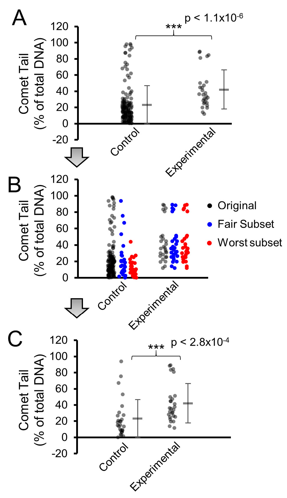 Figure 3. Example of visual bias correction. A. Data comparison control Comet tail quantitation to an experimental condition. Individual data points are plotted for each group adjacent to median and standard deviation indicators. The N in the control group is 145 and the N in the experimental group is 27. With the disparate N, a reviewer of the data may be disinclined to believe the statistical significance showing an increased Comet tail distribution in the experimental group, since more outliers are present in the larger N group. B. Data are input into FairSubset and resultant subgroups are plotted in Microsoft Excel. The Fair Subset represents the subset which best matched the original data using only 27 data points, from 1000 choices of the subsets. The Worst subset represents the subset in the group of 1000 subsets which had the farthest median and standard deviation from the original data. The experimental group is identical since the program defaults to the lowest N from each group; it chose all 27 data points. C. A finalized graph which includes individual data points of the Fair Subset of control compared to the experimental group. The distribution of individual data points is more comparable between groups and the outlier visual bias is reduced. Some statistical significance is lost if represented in this fashion since N is reduced in the larger group, however some authors may choose to indicate in figure legends the original significance if the Fair Subset method is cited solely as a way to reduce visual bias. P-values represent output of a Wilcoxon rank-sum test.