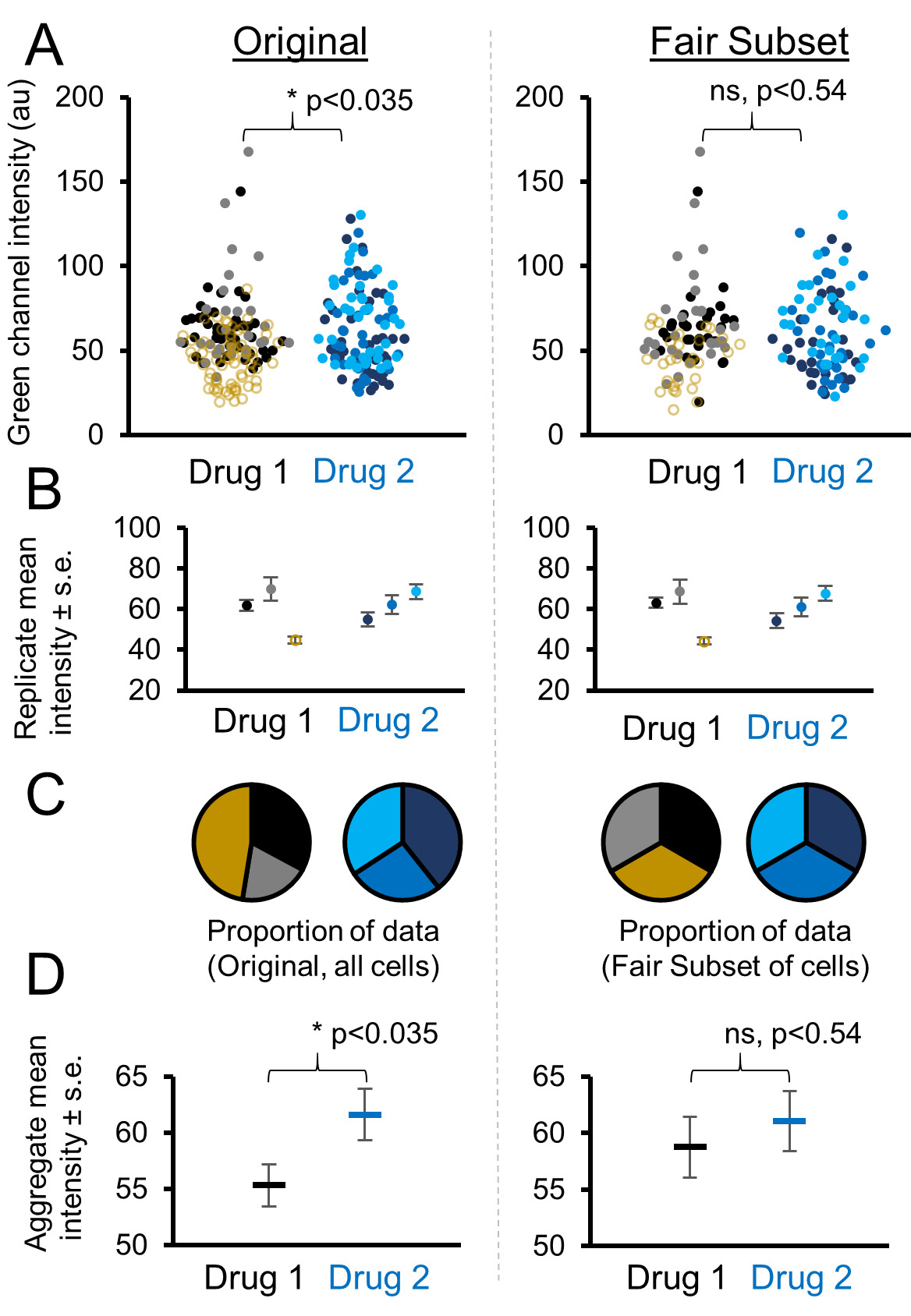 Figure 4. Example of normalizing replicates to avoid a spurious false positive. A. Comparison of immunofluorescence data from two drug-treated conditions and three replicates. Replicates are represented by different shades of grey or blue. One Drug 1 replicate contains substantially more data points and is highlighted in yellow. Data was input into FairSubset and the Fair Subset was downloaded for subsequent statistics and plotting in Microsoft Excel. Before subsetting, a t-test determines the samples are significantly different with a P < 0.05 cutoff. After subsetting identical N from each image, the significance is abrogated. B. The mean ± standard error of each replicate remains the same before and after subsetting, which is by design of FairSubset. C. The proportion of data contributing to the mean is shown in pie charts. Prior to subsetting, one picture dominates the data from Drug 1 with nearly half the data points (yellow slice). After subsetting using FairSubset, this high N replicate represents a fairer proportion of the overall statistics calculations with only 1/3 of the total (N). D. After using FairSubset, the group mean of the three replicates does change, even though the mean of individual replicates does not. This example illustrates a case when biasing the overall data toward a single replicate would be undesirable or unethical. P-values represent the output of a two-tailed unpaired t-test.