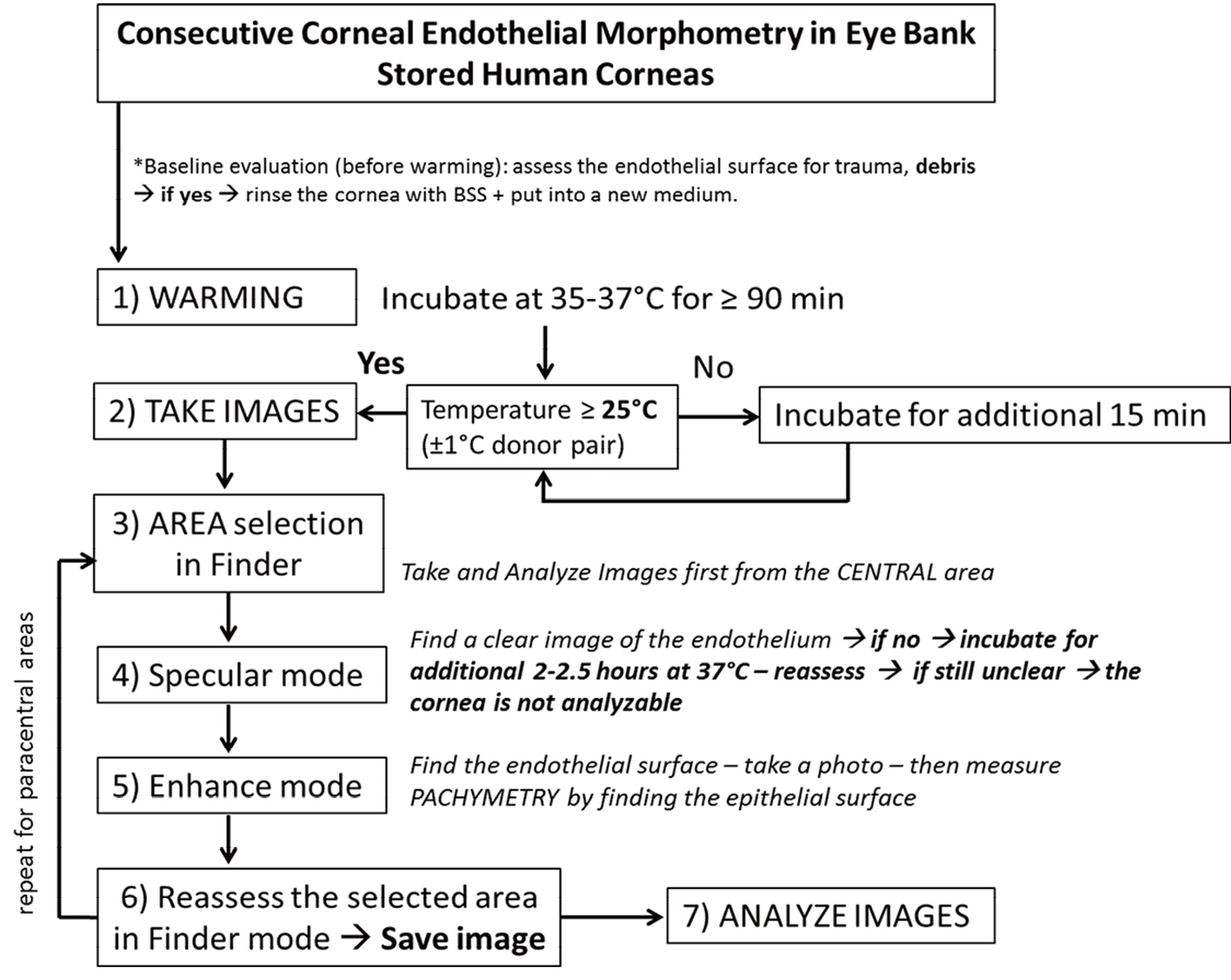 ex vivo dual imaging specular microscope. The protocol was developed to take into consideration the major confounding factors that could skew a proper image evaluation in a research setting.