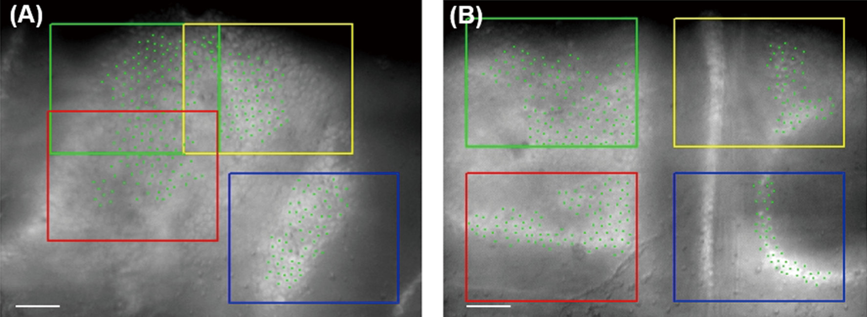 Figure 3. Correct and incorrect image analysis. A. Precisely placed dots into the center of each visible cell in a circular fashion in each frame. B. Incorrect placement of dots forming L, V or U shapes. Scale bars 100 µm.