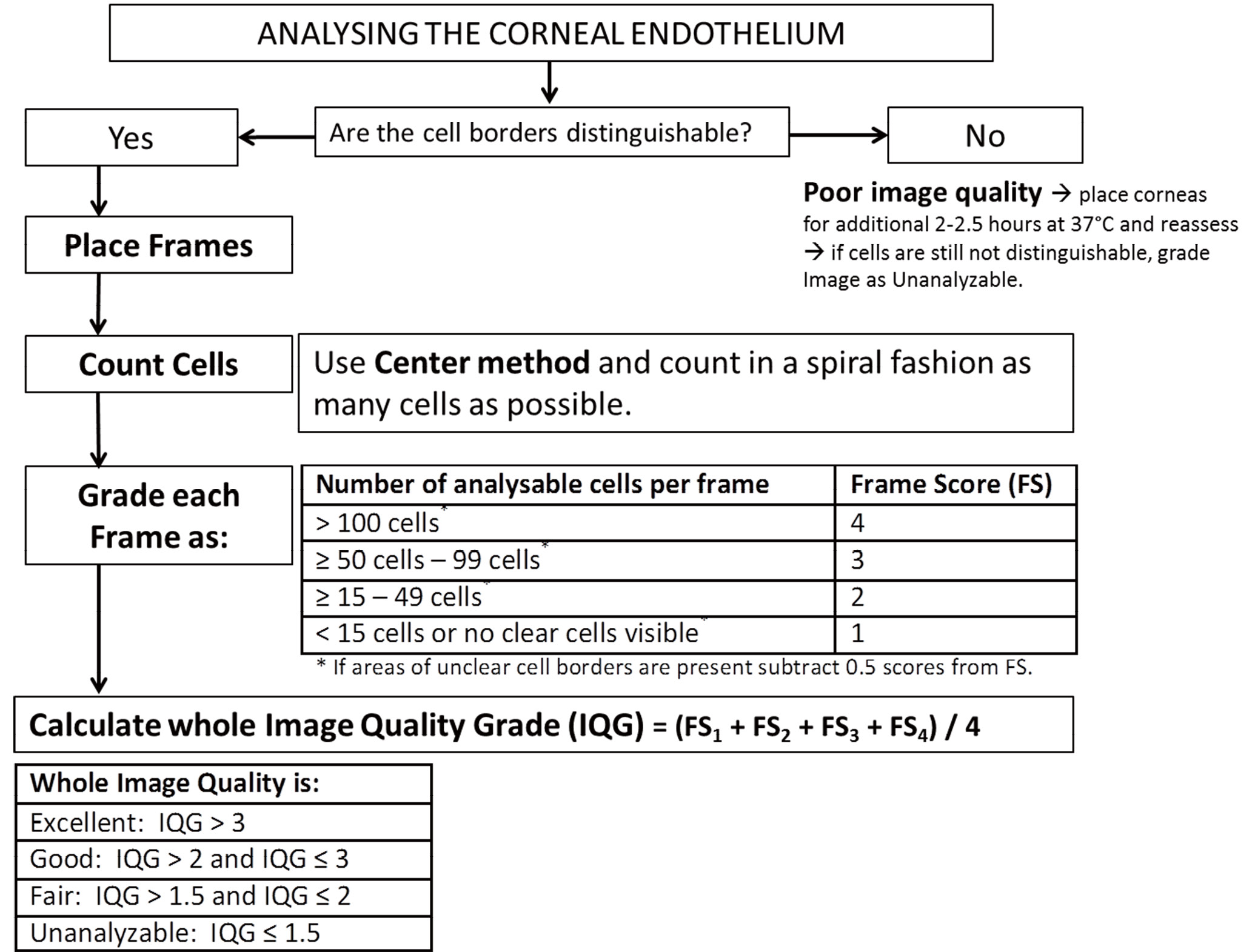 12] to account for the larger viewing area. Each frame is easily gradable based on the maximum number of analyzable (distinct cell borders, contiguous with each other) cells with the Center method and can be graded as score 4 if more than 100 cells were analyzed; as score 3 if 50–99 cells were analyzed; as score 2 if 15–49 cells were analyzed; or score 1 if less than 15 or no cells could be observed. If areas of continues clear cells with unclear cell borders are present in the analyzable frame, subtract 0.5 points from the obtained frame score. The whole wide-field specular image quality is obtained through calculating the algorithmic average of all 4 frames (Image quality = (frame score (FS)1 + FS2 + FS3 + FS4)/4). Excellent and good quality images enable more reliable ECD and morphometric parameter analysis and can be defined as the whole Image Quality Grade (IQG) > 2 (