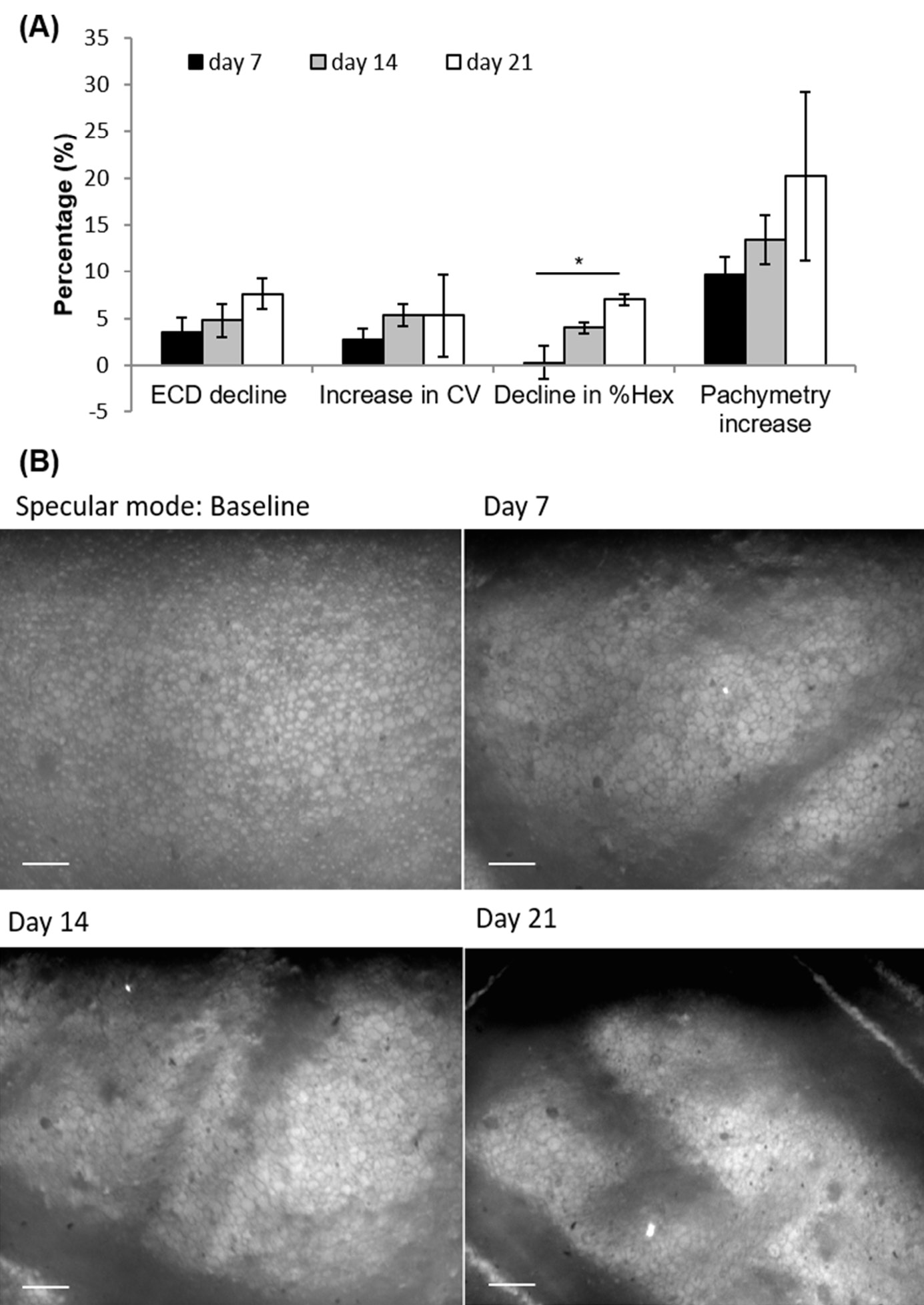 Figure 5. Anticipated donor corneal endothelial morphometry changes over time in hypothermic storage for 3 weeks (n = 3). A. The mean % of central endothelial cell density (ECD) decline, the increase in coefficient of variation (CV), the decline in % of hexagonal cells (%Hex) (*P = 0.01; Repeated Measures ANOVA) and the percentage of pachymetry increase from baseline using this protocol. Data are mean ± SEM of three samples. For ECD, CV and pachymetry change the difference between each time point is not statistically significant, using paired 2-sided t-test (P > 0.05). The decline in %Hex is statistically significant between day 7 or 14 and day 21, using a paired 2-sided t-test (both P = 0.02). B. Specular endothelial images from baseline, after 7, 14 and 21 days from the central area. After 2 weeks Descemet’s membrane folds with attached endothelium became more pronounced. Scale bars 100 µm.