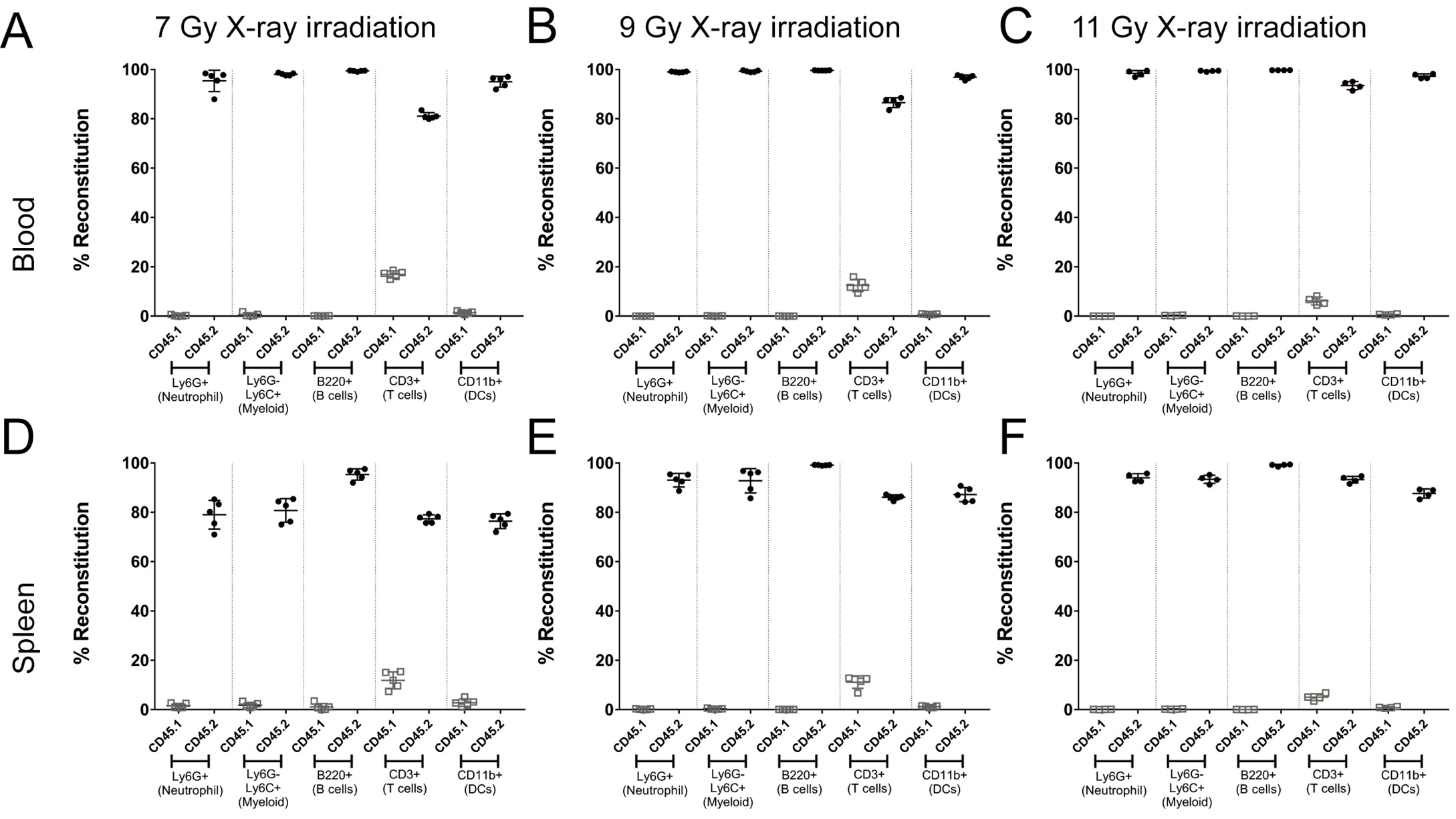 To begin, we evaluated the reconstitution of hematopoietic cells in animals that had been irradiated using an X-ray based source. The X-ray irradiator used was purchased from Faxitron and irradiation was performed using the Thoraeus filter, a hybrid filter composed of tin, copper, and aluminum. This filter provides beam hardening at the expense of a lower dose rate. However, the overall dose rate was adjusted to provide roughly the same irradiation rate constant as the cesium irradiator used in these experiments. While previous publications had suggested that X-ray irradiation could provide comparable relative biological equivalent (RBE) at lower doses [3], our initial experiments compared a dose range of X-ray irradiation. A total dose range of 7 to 11 grays was performed. Animals were irradiated twice, with half the total dose delivered approximately four hours apart, prior to the introduction of congenic labeled bone marrow (CD45.1+). Animals were then provided antibiotics in drinking water supplied ad libitum for 5 d post irradiation to prevent any infections due to immunosuppression. Six to eight weeks later, animals were euthanized to determine the degree of chimerism in the blood and spleen. In these experiments, the recipient animal was CD45.1 (congenic) and the donor bone marrow was CD45.2 (WT for C57BL6). The overall degree of chimerism in the blood (Fig. 1A-1C) and the spleen (Fig. 1D-1F) was high with X-ray irradiation, with most populations showing >90% reconstitution with donor marrow (CD45.2+). Neutrophils (Ly6G+), myeloid cells (Ly6G-, Ly6C+), B cells (B220+), and dendritic cells (CD11b+) all showed a significant and near complete reconstitution with donor marrow (Table 2). As previously published, a population of CD3+ T cells remains from the original host (CD45.1+) and represents a radio-resistant subset of the T cell population that would be expected to diminish over time [7].