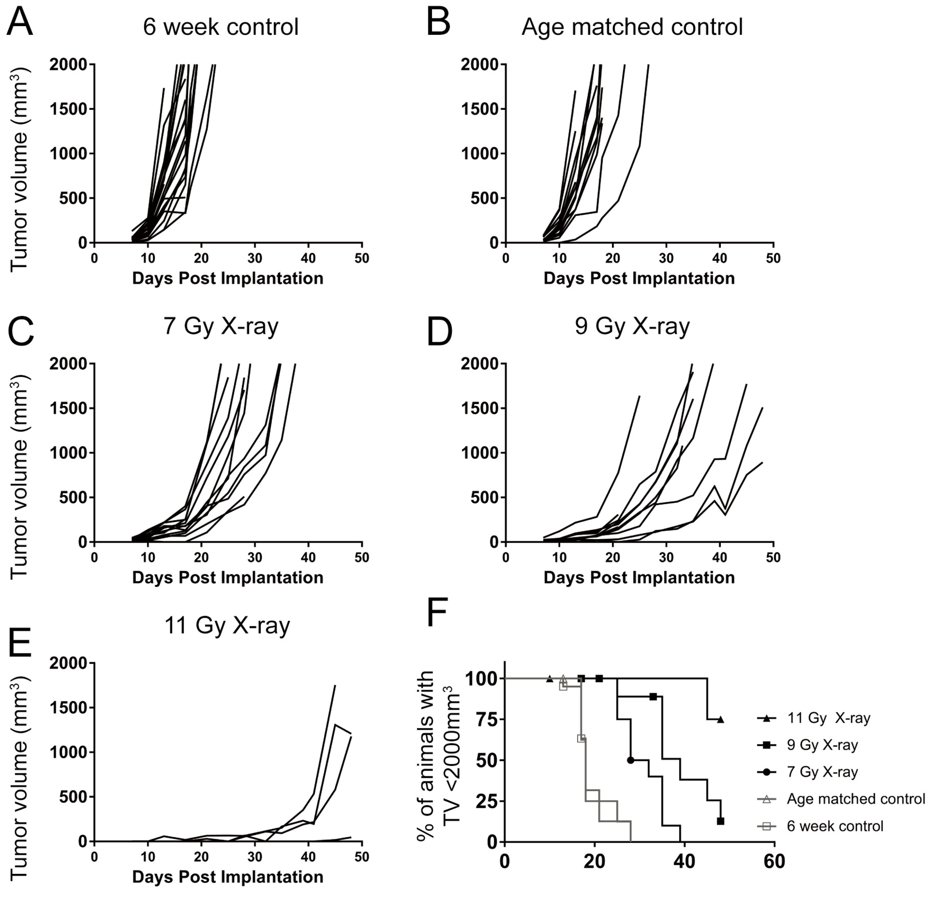 Figure 2. Irradiation and reconstitution results in a delay in B16F10 tumor growth dependent of initial radiation dose. 6 week old (A), age matched (B), or 7-11 Gy irradiated and reconstituted (C-E) C57Bl6 animals were implanted with 2 × 105 B16F10 syngeneic melanoma tumor cells. In animals irradiated with 11 Gy, 5/9 tumors failed to engraft (E). In groups irradiated with 7 Gy and 9 Gy, all tumors (10/10) grew out. The growth rate of the tumors, however, was slower with increasing radiation doses (F). This figure is representative of at least two independent experiments.
