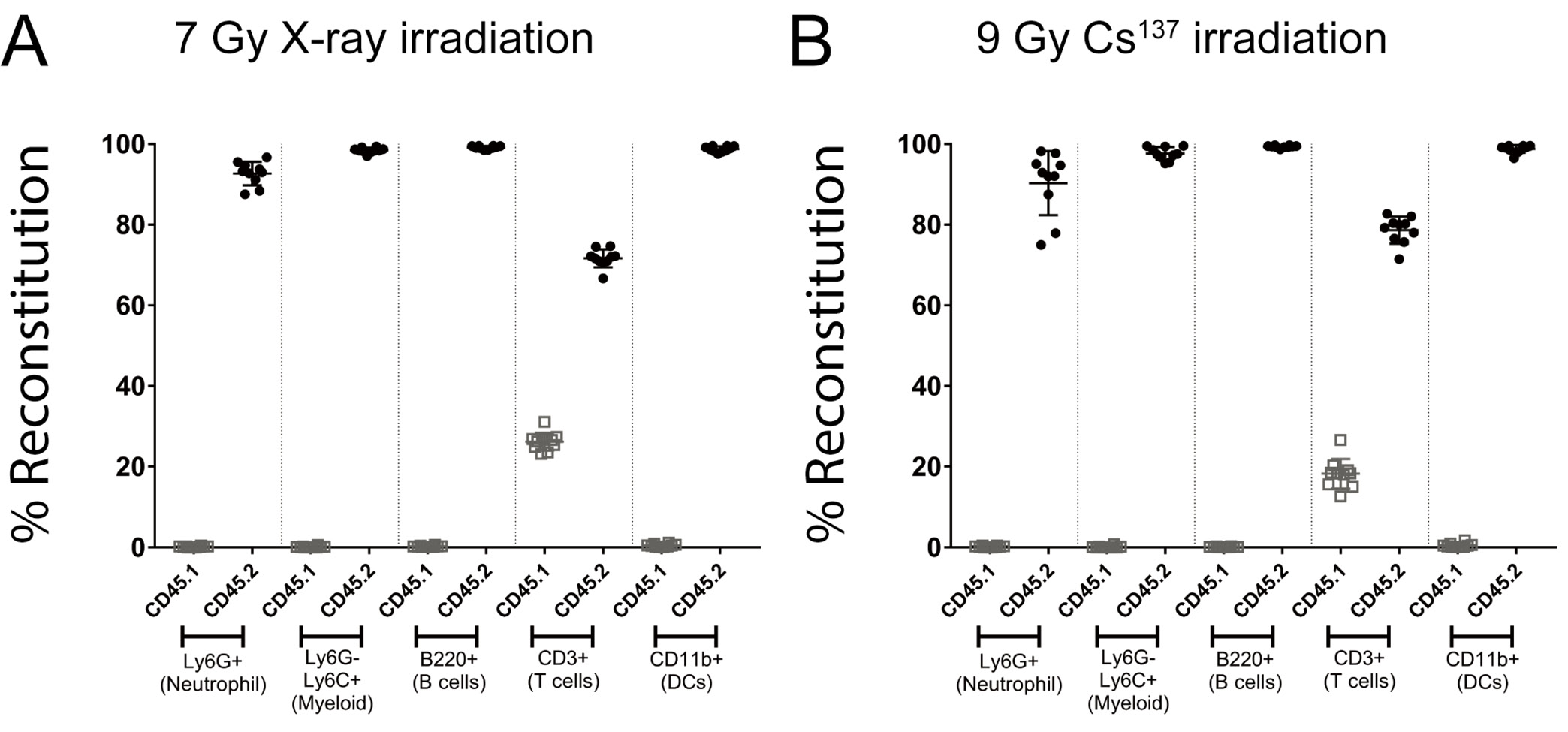 Figure 3. Chimerism at 8 weeks post reconstitution in the blood of X-ray and cesium irradiated animals. Donor marrow reconstitution was evaluated in animals that were irradiated with X-ray (A) or Cesium137 (B). Donor hematopoietic cells (CD45.2+; closed circles) were differentiated from recipient hematopoietic cells (CD45.1+; open squares) by flow cytometry using congenic markers. Hematopoietic cells were identified based on commonly expressed leukocyte antigens. The figure is representative of at least two independent experiments. Data represents mean +/- standard deviation with 10 mice per group.