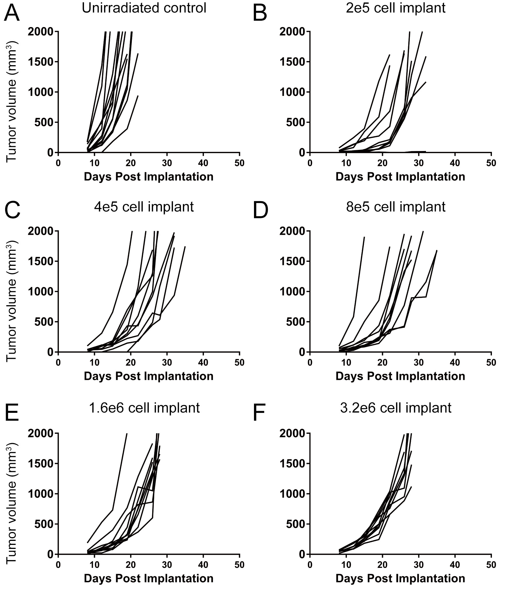 Figure 4. Starting cell implantation has a minimal effect on tumor growth rate post irradiation and reconstitution. Unirradiated, age matched animals were used as a control comparison (A). Animals were irradiated with 7 grays of X-ray irradiation and reconstituted with congenic labeled bone marrow. 8 weeks post reconstitution, animals were implanted with varying doses of B16F10 syngeneic melanoma tumor cells ranging from 2 × 105 to 3.2 × 106 cells per mouse (B-F).