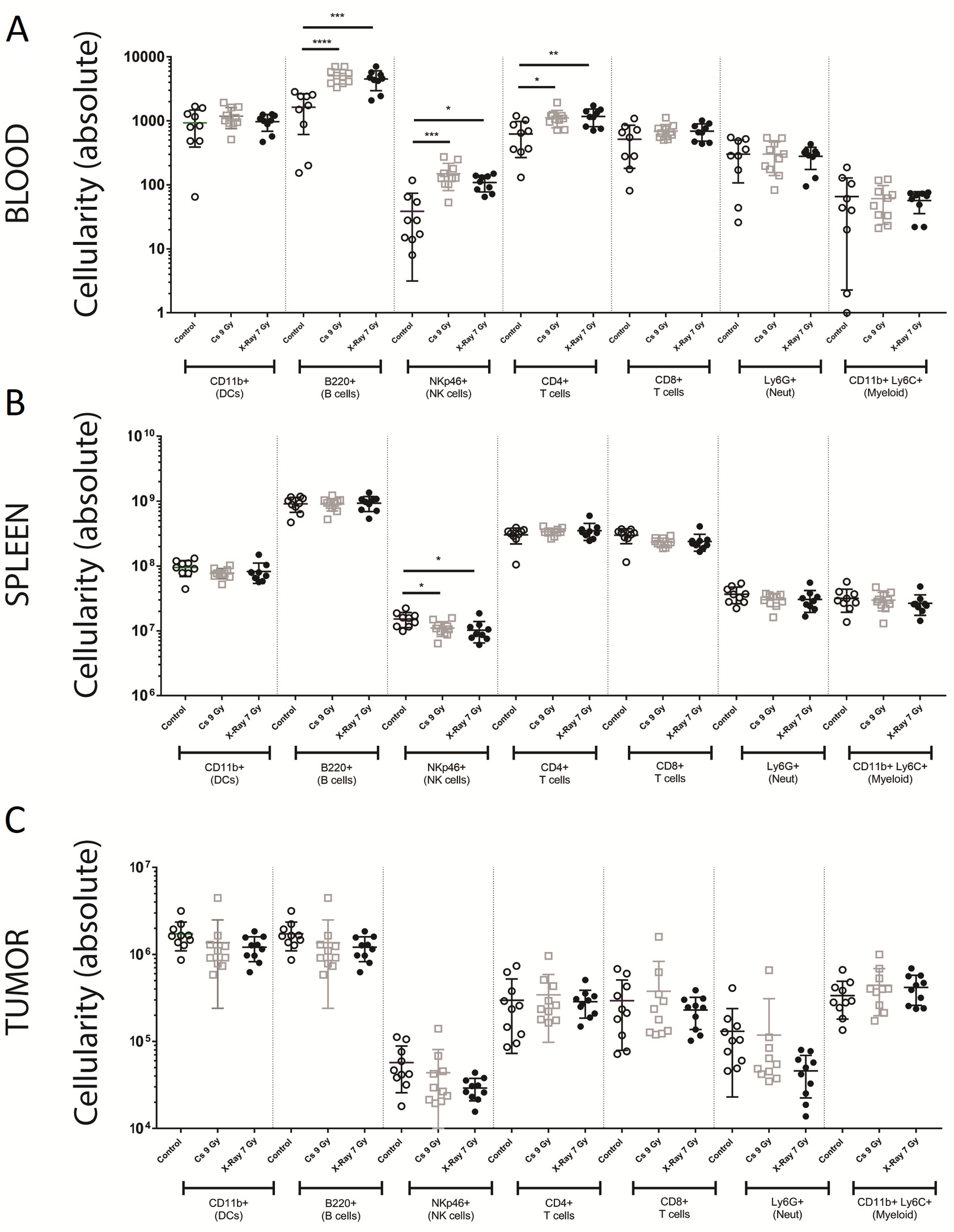 Figure 5. The tumor microenvironment in reconstituted animals is comparable. Age matched unirradiated animals (control; open circles), Cesium137 irradiated and reconstituted (Cs 9 Gy; open squares), and X-ray irradiated and reconstituted (X-ray 7 Gy; closed circles) animals were implanted with 4 × 106 B16F10 syngeneic tumor cells subcutaneously. 13 d post implantation, blood (A), spleen (B), and tumors (C) were analyzed for the degree of donor cell reconstitution. Absolute cell number is shown for CD11b+ dendritic cells, B220+ B cells, NKp46+ NK cells, CD4+ T cells, CD8+ T cells, Ly6G+ neutrophils, and CD11b+Ly6C+Ly6G- myeloid cells. Data represents mean +/- standard deviation with 10 mice per group.