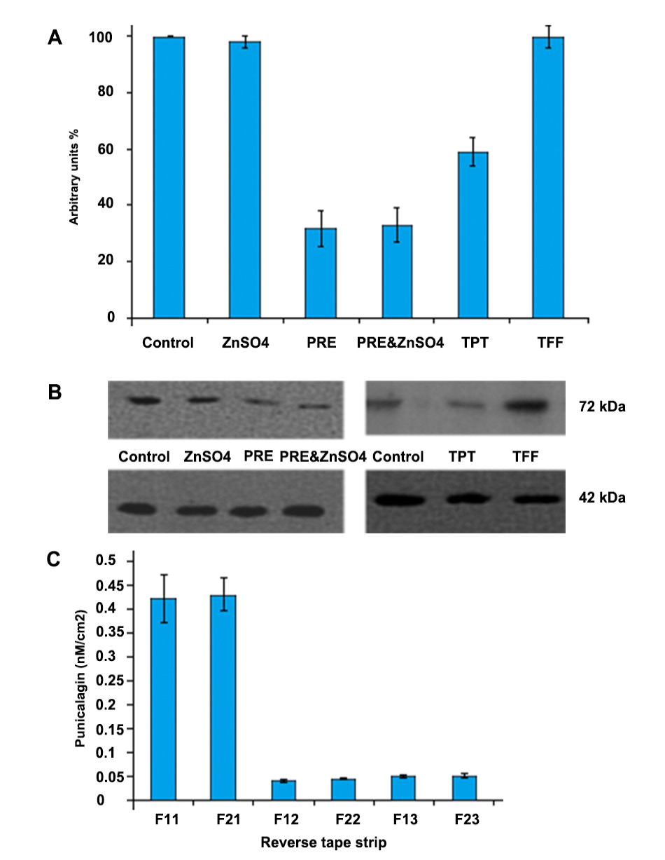 - Houston DMJ, Robins B, Bugert JJ, Denyer SP, Heard CM (2016) In vitro permeation and biological activity of punicalagin and zinc (II) across skin and mucous membranes prone to Herpes simplex virus infection. Eur J Pharm Sci 96: 99-106. doi: 10.1016/j.ejps.2016.08.013. [View Article] [PubMed] [Google Scholar]