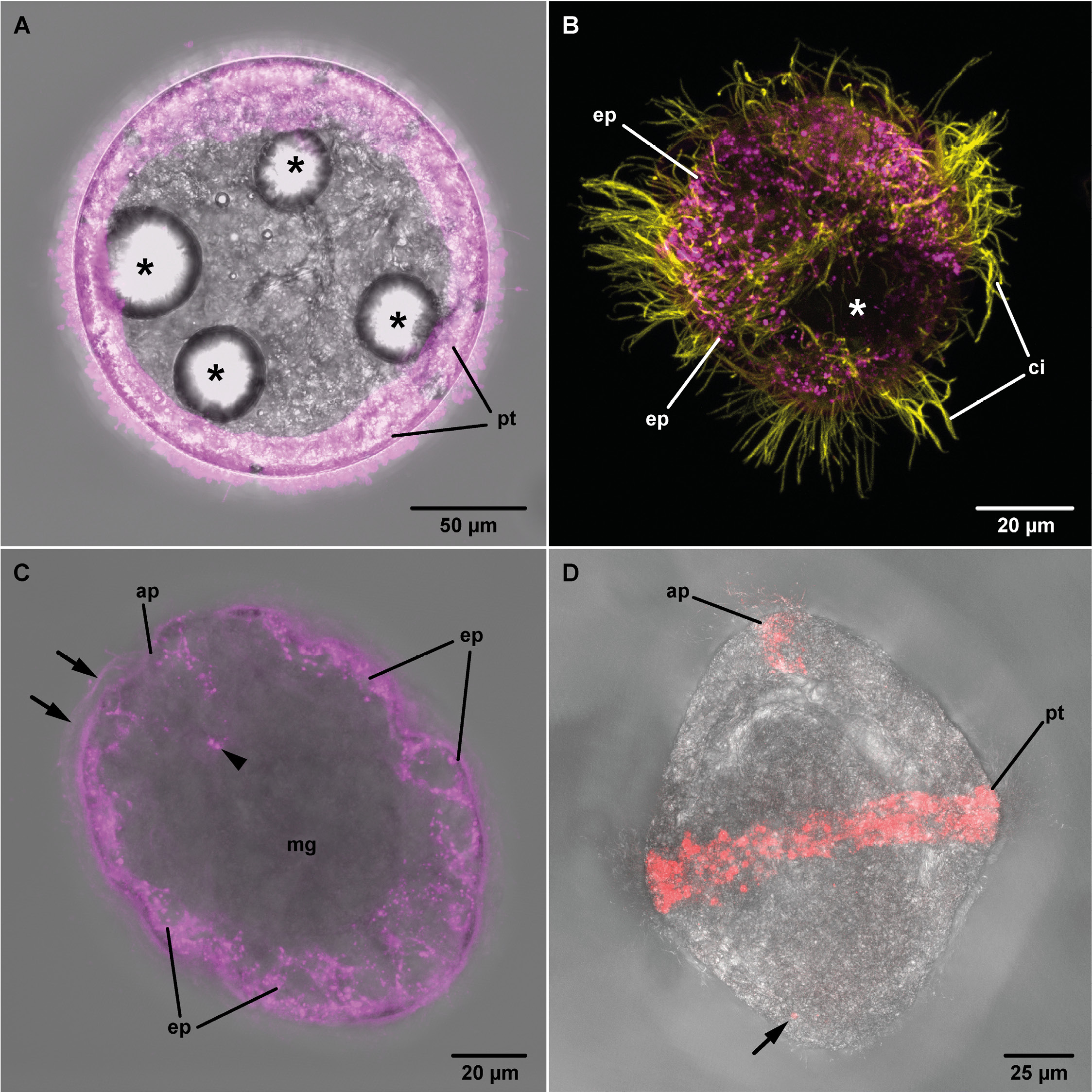 Figure 1. Young larvae after staining with DiI (A) or DiI/Pluronic F-127 (B and C) or DiD/Pluronic F-127 (D), cLSM (magenta: DiI, yellow: anti α-tubulin, red: DiD). A. Platynereis dumerilii, 24-hours old larva, maximum projection (apical view): the ciliated prototroch cells (pt) are stained. Note the large yolk vesicles in the four gastrulated macromeres (asterisks). B. Mytilus edulis, 21-hours old larva, maximum projection (anterior to upper left): only epidermal cell (ep) with cilia (ci) show DiI signal, unciliated regions of the epidermis are unstained (asterisk). C. Cephalothrix oestrymnica, 2-day old larva, maximum projection of 5 middle sections (4.4 µm; anterior to upper left): only the epidermal cell (ep) layer including the apical tuft (arrows) is stained; cells of the midgut epithelium (mg) are unstained. Cells of the apical plate (ap) extend deeply into the larva (arrowhead). D. Thalassema thalassema, 44-hours old larva, maximum projection (anterior is up): fluorescent DiD signals detectable in the ciliated prototroch (pt) and in some ciliated cells of the apical plate (ap). Note the small, dot-shaped signal visible in an unciliated part of the larva (arrow).